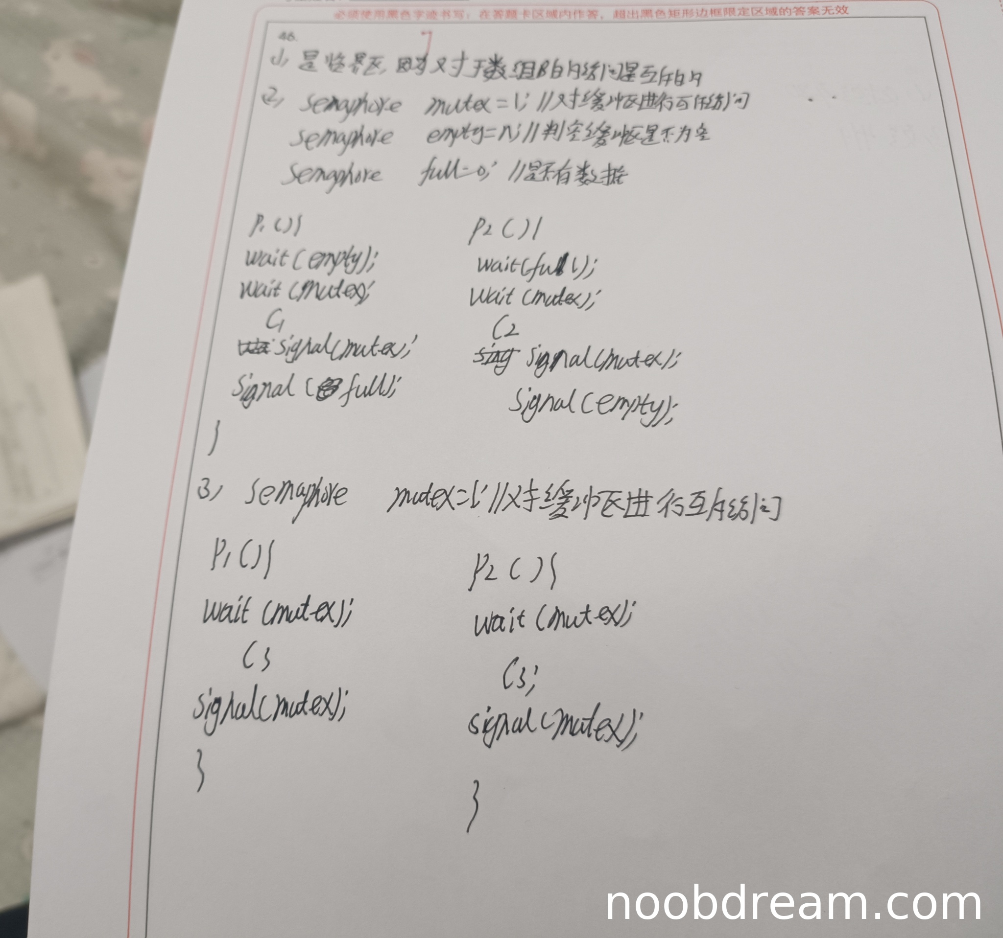 学生正确使用了mutex信号量来实现C3操作的互斥访问,信号量初值为1,wait和signal操作使用正确,与标准答案完全一致。得3分。