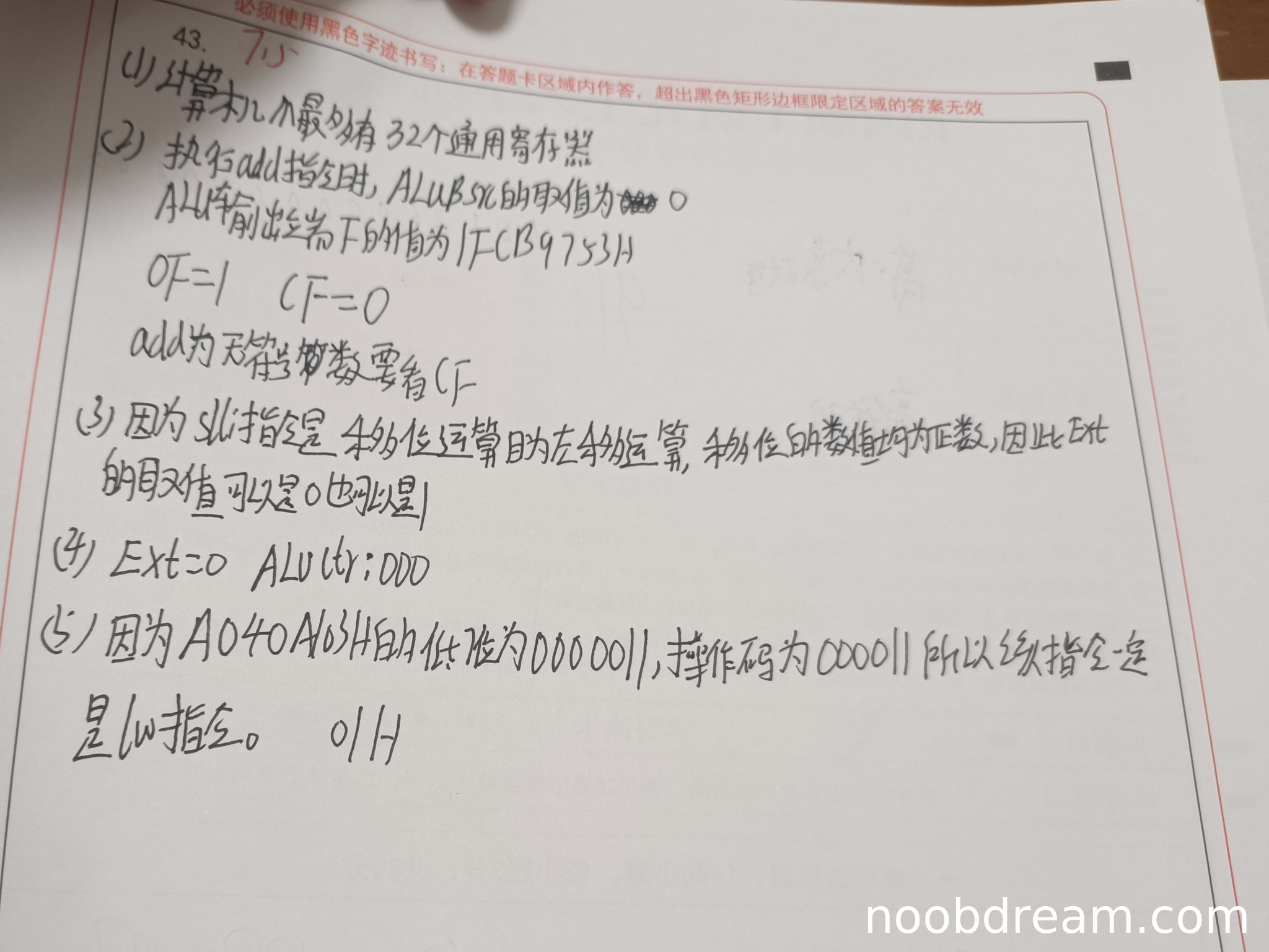 学生回答Ext=0错误(应为1),扣1分;ALUctr=000正确。得分:1分。