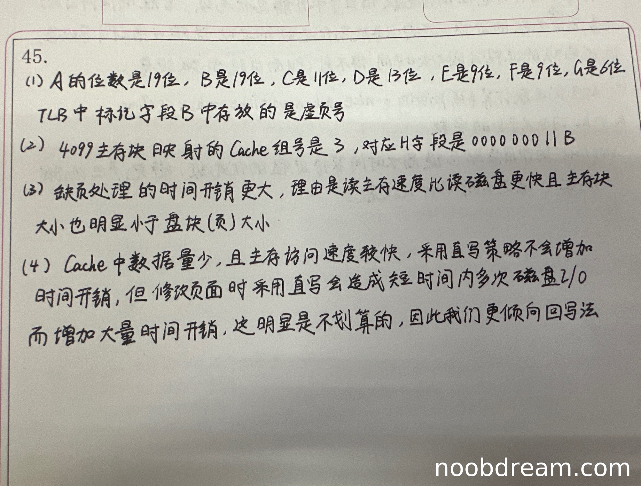 学生答案中A=19、B=19、C=11、D=13、E=9、F=9、G=6,与标准答案完全一致,得7分。对于TLB标记字段B的内容,学生回答"虚页号"正确,得1分。本小题共得8分。