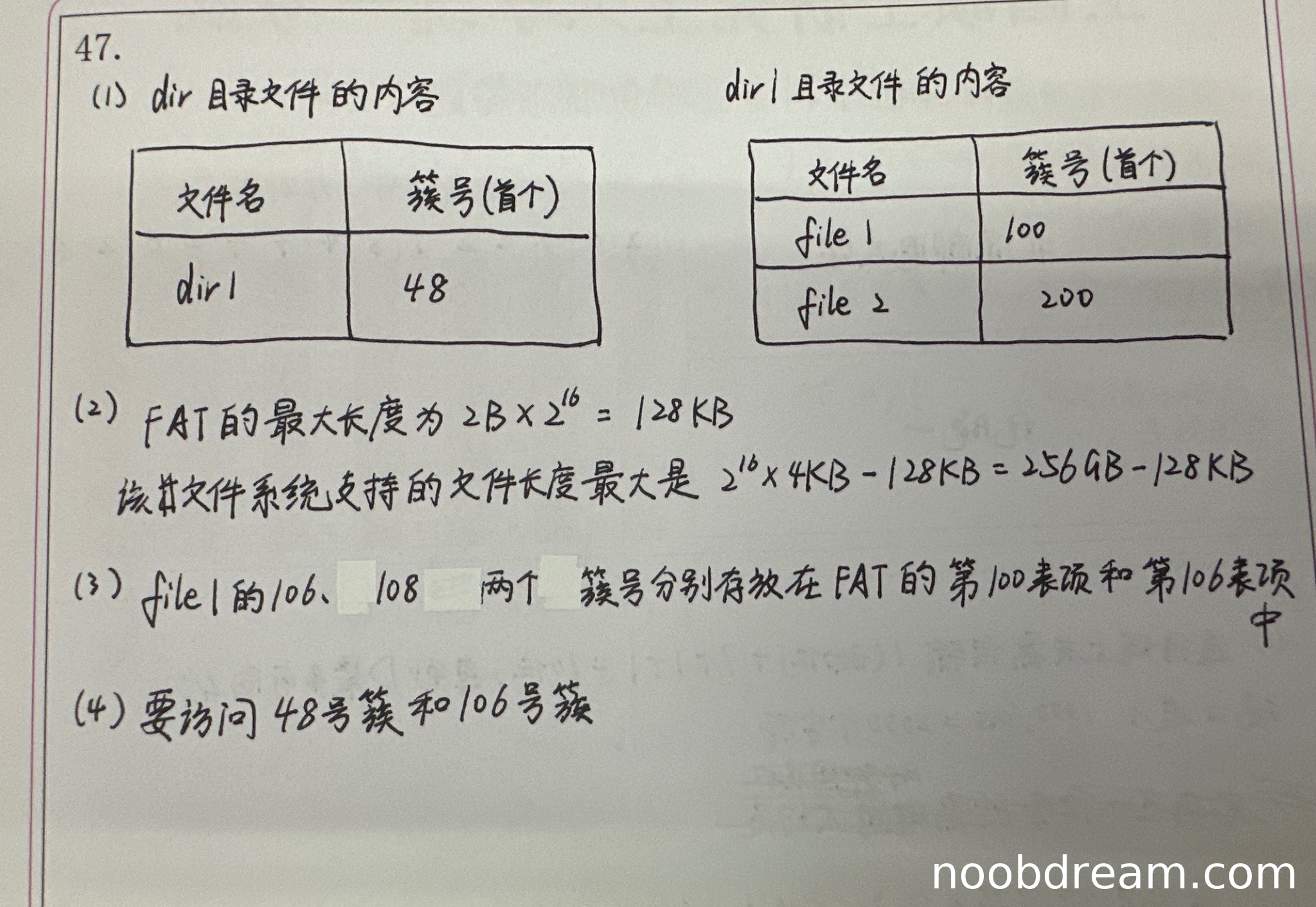 学生答案中FAT的最大长度计算正确,为128KB。但文件最大长度的计算有误,学生答案为256GB - 128KB,而标准答案为256MB。这里存在逻辑错误,因为簇号占2字节,FAT表项数为2^16,每个簇4KB,最大文件长度应为2^16 × 4KB = 256MB,学生的计算错误导致答案不正确。因此,FAT最大长度部分得1分,文件最大长度部分得0分,本题总得1分。