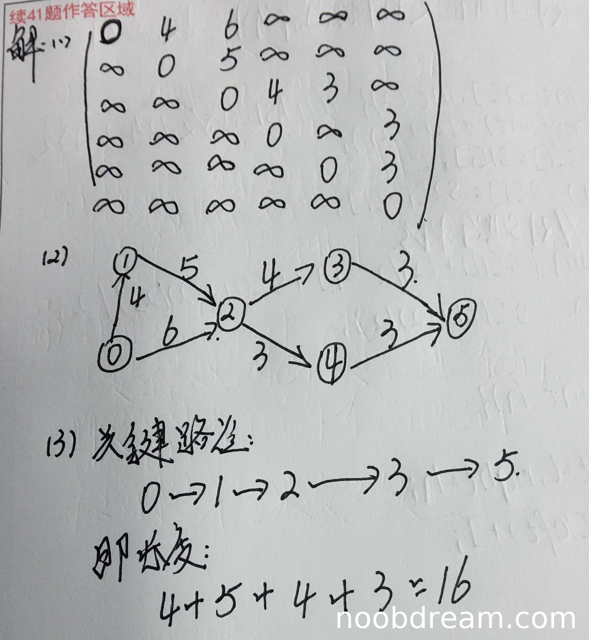 学生描述的网络图边权与标准答案一致,虽然邻接矩阵有误,但图描述正确,因此不扣分,得2分。