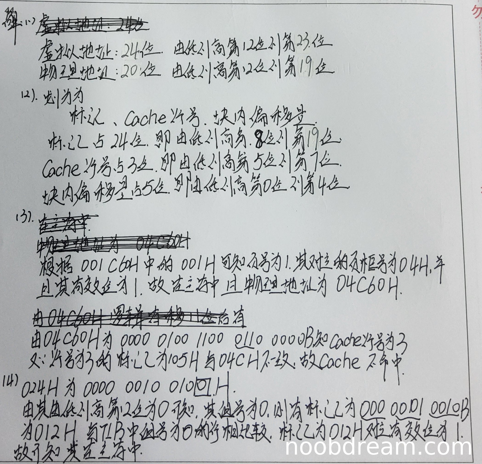 学生正确判断页面在主存中(虚页号1对应页框号04H有效),物理地址04C60H正确,Cache不命中判断正确(行号3标记不匹配)。但计算Cache行号时,学生从04C60H推导出行号3的方法描述混乱(标准应使用物理地址中间3位),且标记比较对象描述有误(学生写105H或05H与04CH比较,实际应为064H与04CH)。由于核心结论正确但推导过程有瑕疵,扣1分。得3分。