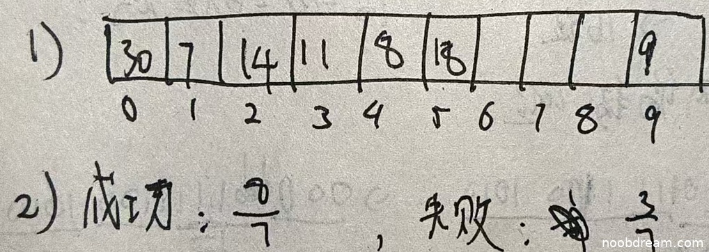 学生给出了查找成功和查找不成功的平均查找长度,但数值与标准答案(成功≈1.714,失败≈2.571)不符。第一次识别结果为成功2/7、失败3/7,第二次识别结果为成功4/7、失败3/7,均错误。可能由于散列表构造错误导致计算错误,因此扣分。得0分。