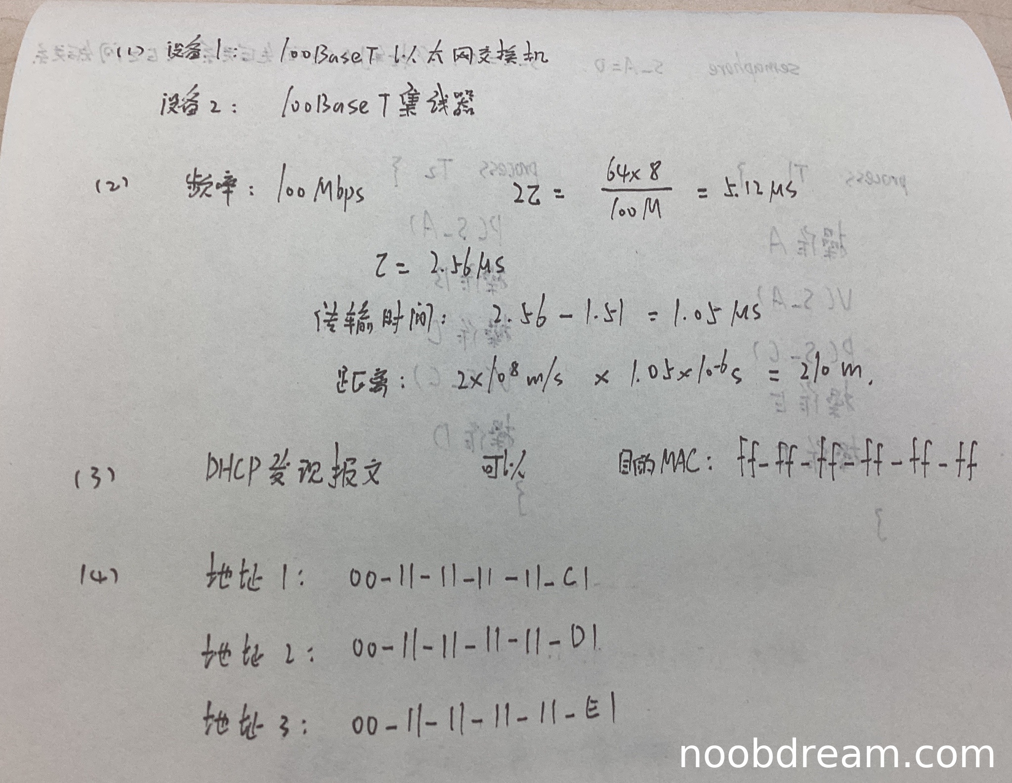 学生答案:计算过程正确,最终距离210m与标准答案一致。学生使用了正确的公式(2Z=64×8/100M),考虑了设备2的额外延迟(2.56-1.51=1.05μs),并正确计算了传播距离(2×10^8×1.05×10^-6=210m)。虽然表达方式与标准答案略有不同,但思路和结果正确,得1分。