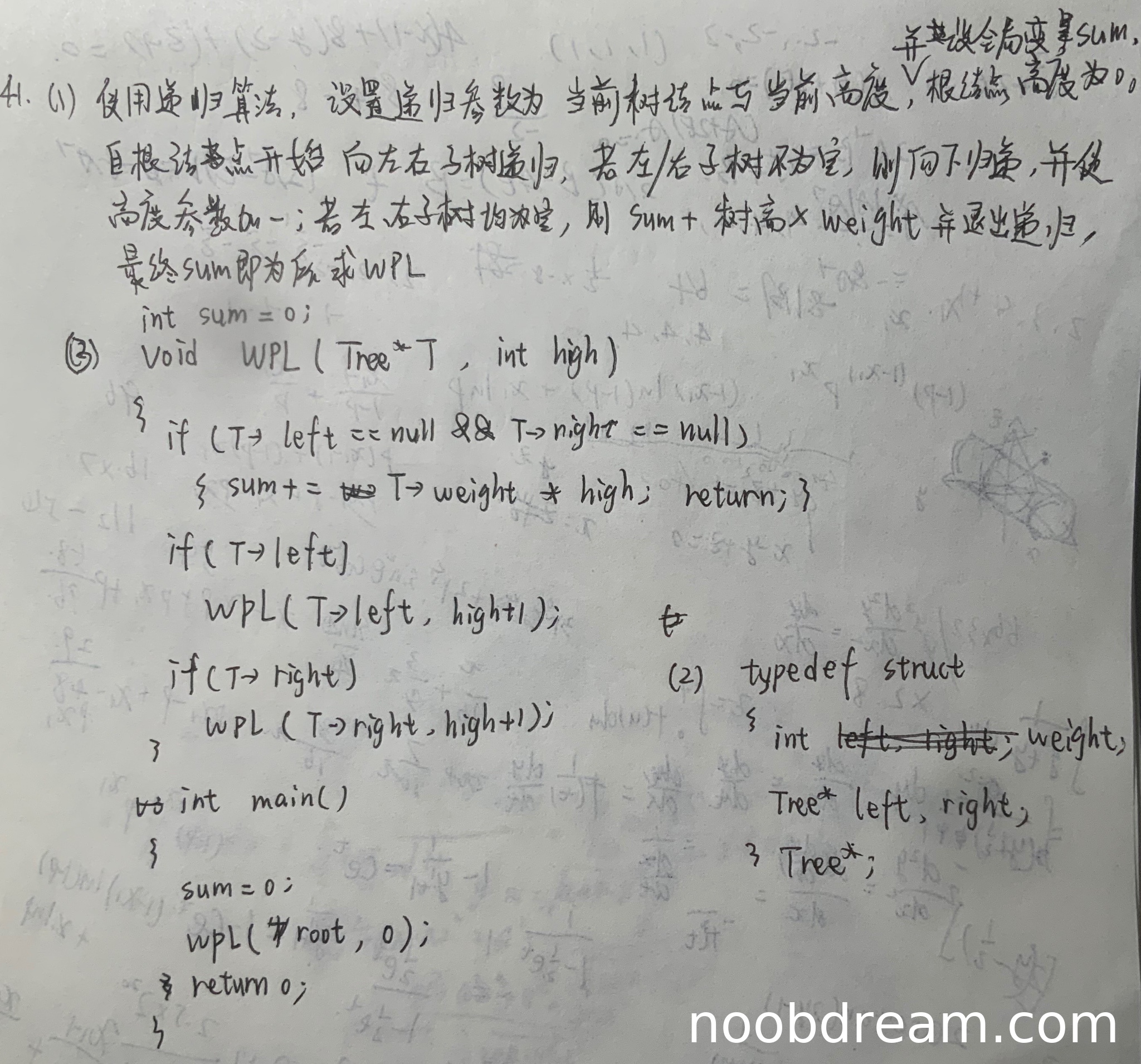 理由:算法实现基本正确,使用了先序遍历递归方法,正确判断叶子节点并累加wpl,递归时高度参数正确加1。但存在以下问题: