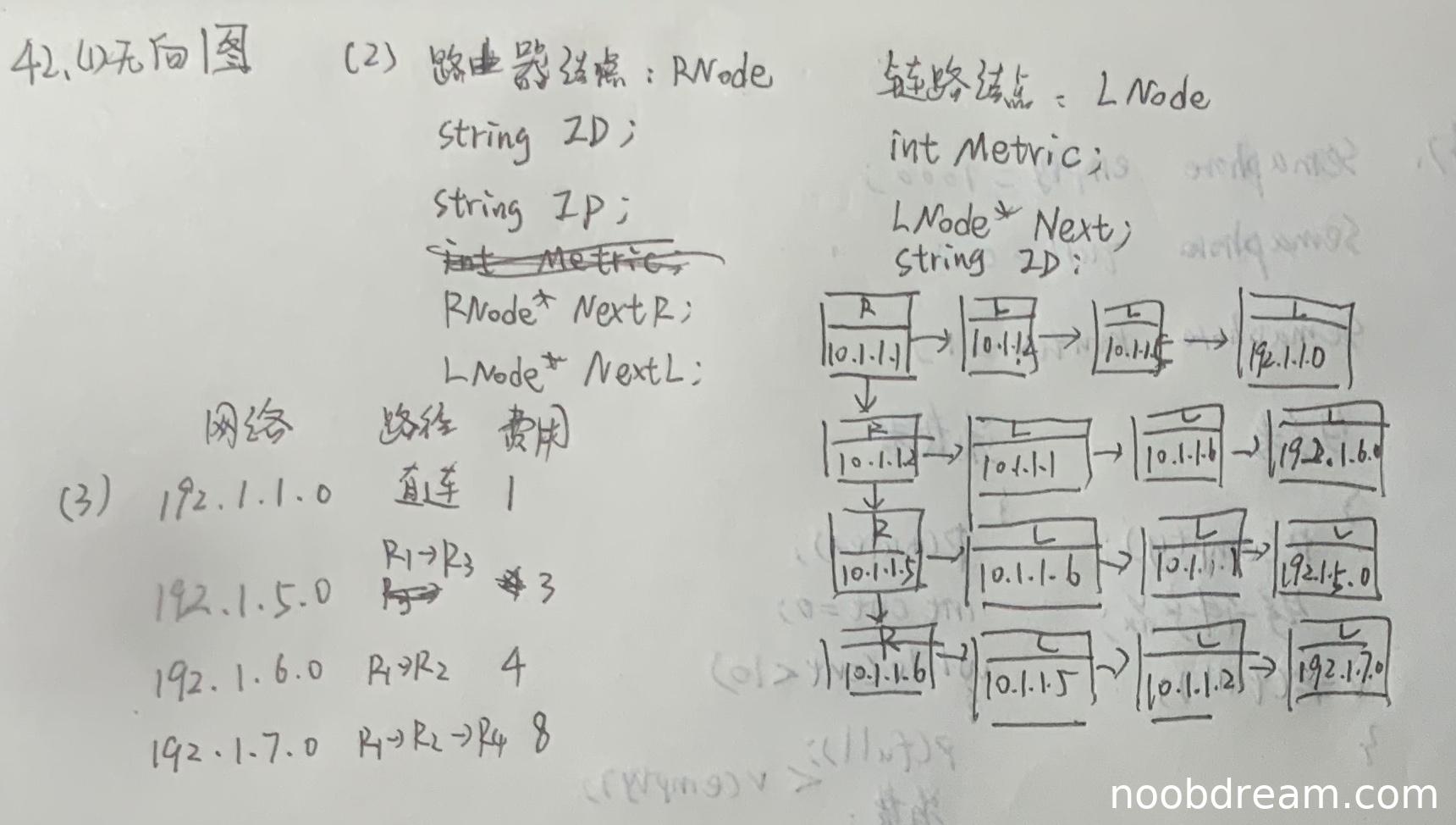 学生设计了链式存储结构,包含路由器结点和链路结点,基本能够表示网络拓扑关系。但存在以下问题:
