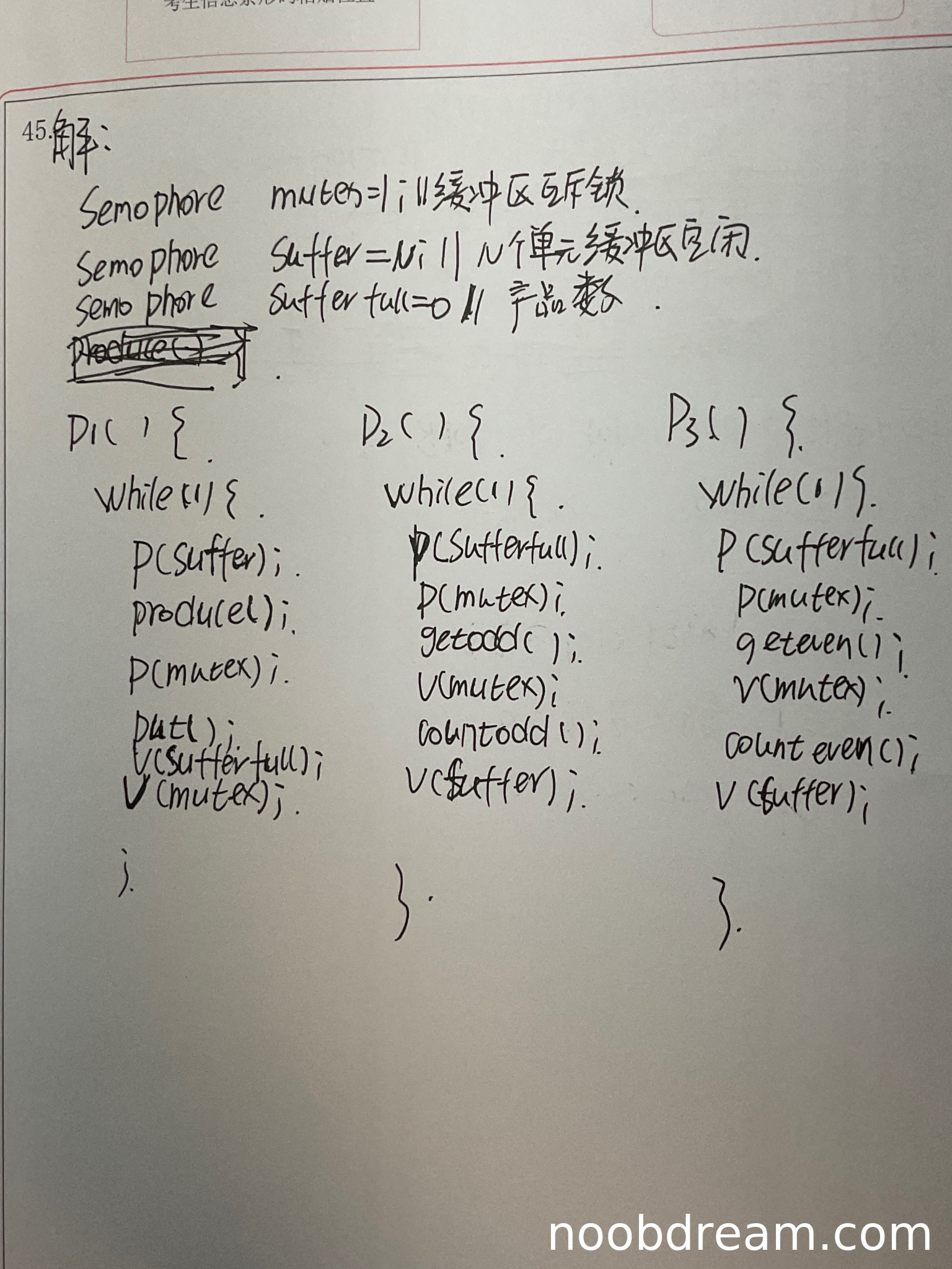 学生定义了三个信号量:mutex(互斥)、Suffer(对应empty)、Sufferfull(对应产品数)。但缺少区分奇偶数的同步信号量(odd和even),这会导致P2和P3无法正确区分奇偶数。扣1分。