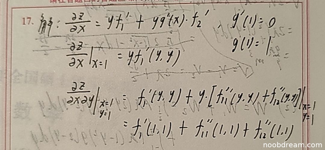 关键错误:在最后结果中多出了一项 \(f_{12}''(1,1)\)。标准答案为 \(f_1'(1,1) + f_{11}''(1,1)\)。这是因为在计算 \(\frac{\partial}{\partial y}[f_1'(xy, yg(x))]\) 时,当 \(x=1\) 且 \(g(1)=1\),第二变量为 \(y \cdot 1 = y\),所以 \(f_1'\) 的两个变量都是 \(y\),求偏导时链式法则应为 \(\frac{\partial f_1'}{\partial y} = f_{11}'' \cdot x + f_{12}'' \cdot g(x)\),代入 \(x=1, g(1)=1\) 后为 \(f_{11}''(1,1) \cdot 1 + f_{12}''(1,1) \cdot 1\),但这里学生似乎错误地认为第二变量是常数或错误应用了链式法则,实际上在 \(x=1\) 时,\(f_1'(y,y)\) 对 \(y\) 求导应为 \(f_{11}''(y,y) \cdot 1 + f_...