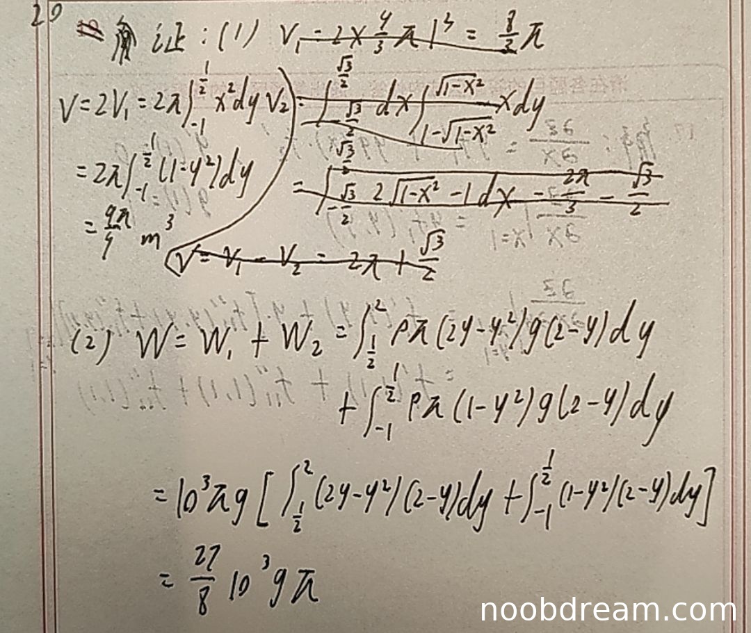 学生答案中功的计算公式正确:\( W = \int_{\frac{1}{2}}^{2} \rho \pi (2y - y^2) g (2 - y) \, dy + \int_{-1}^{\frac{1}{2}} \rho \pi (1 - y^2) g (2 - y) \, dy \),且正确代入 \( \rho = 10^3 \)。但最终计算结果 \( \frac{27}{8} \times 10^3 g \pi \) 与标准答案 \( \frac{27}{4} \times 10^3 g \pi \) 不符,表明积分计算有误。由于思路正确但结果错误,扣 2 分。得分:3.5 分。