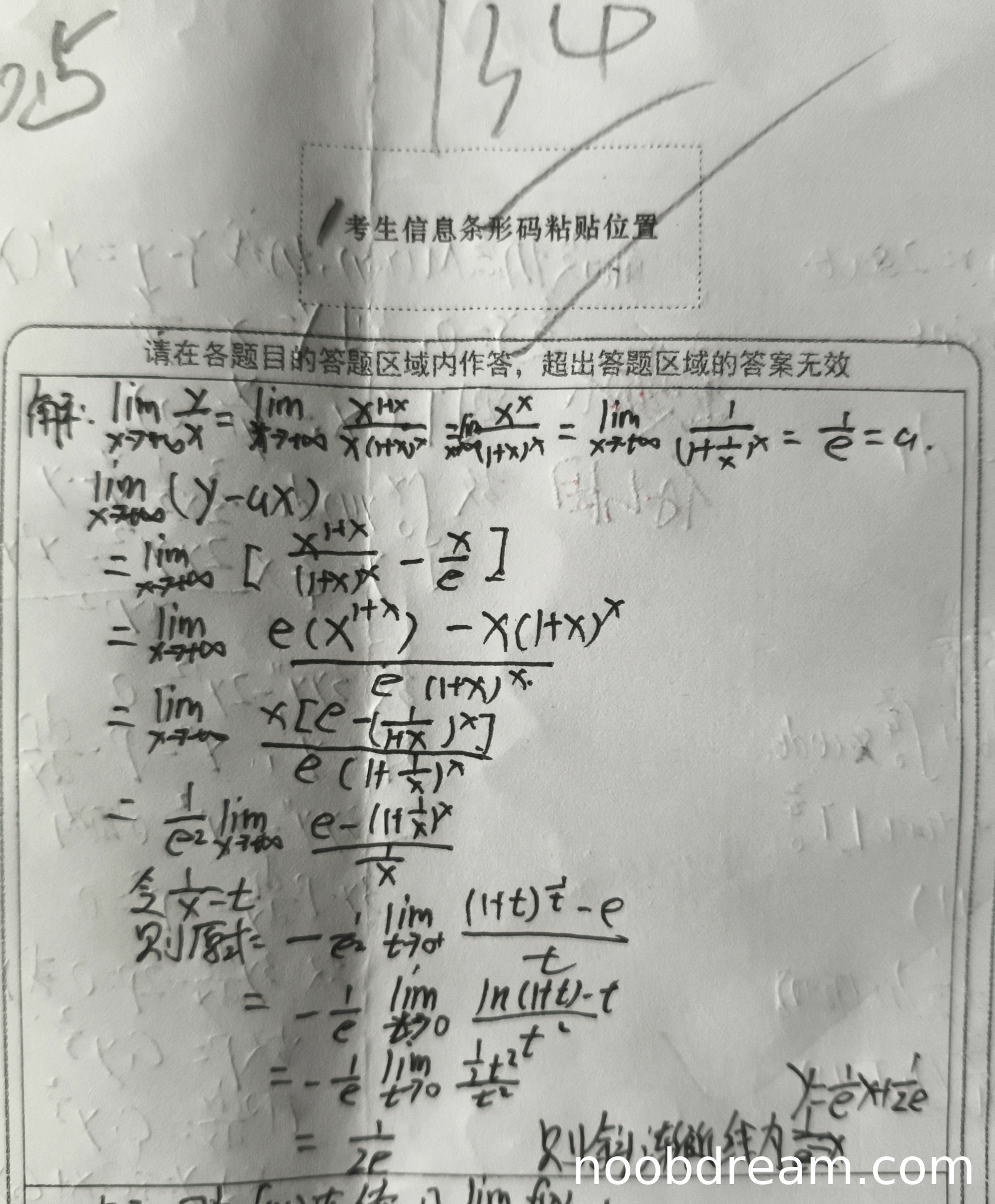 学生正确计算了斜率k:k = lim_{x→+∞} y/x = 1/e。虽然第一次识别中表达式"x + x"可能是"x^x"的误写,但后续计算正确,不影响核心逻辑。得5分。