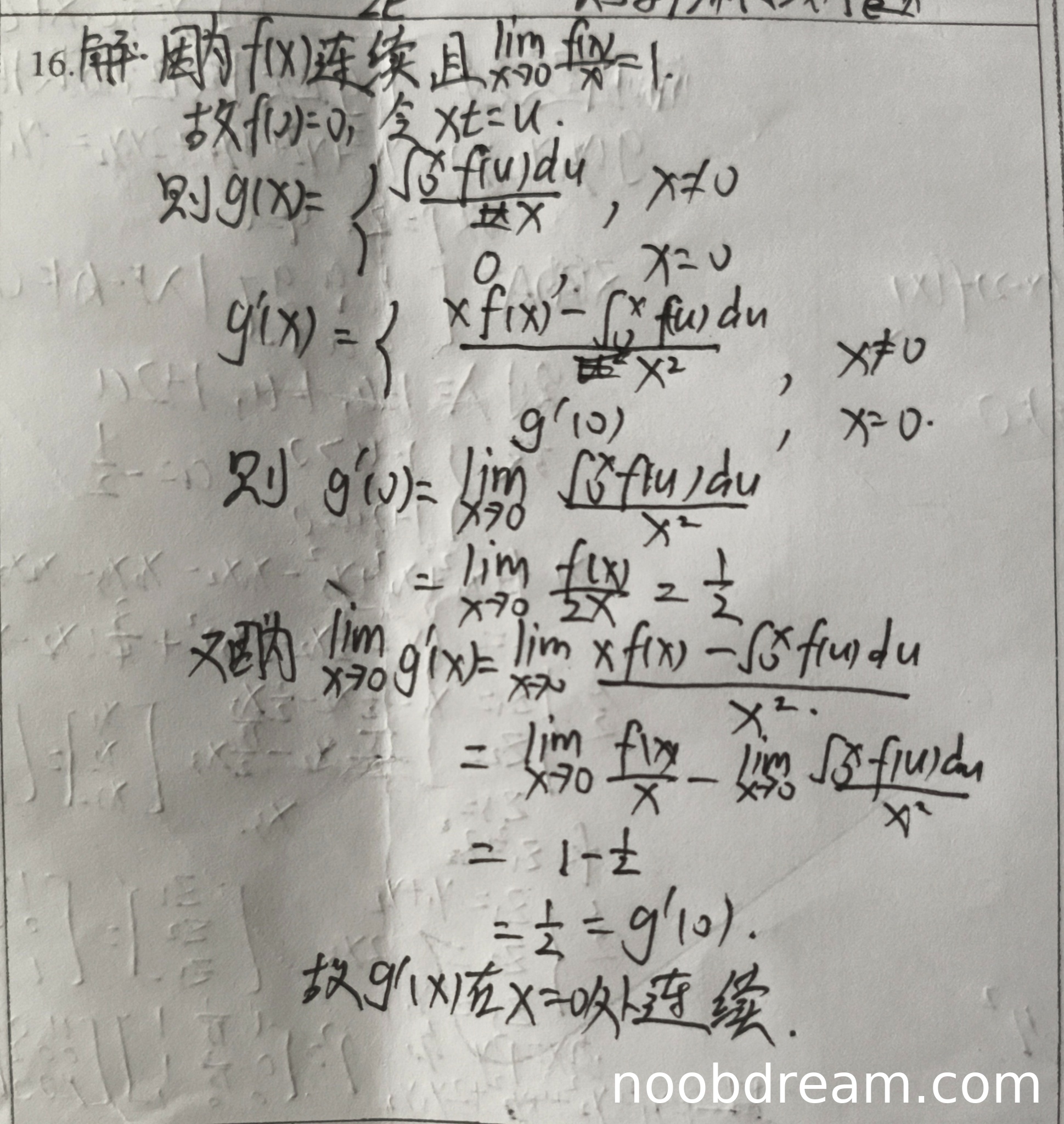 - 正确计算了g'(x)在x≠0时的导数:g'(x) = [xf(x) - ∫₀ˣf(u)du]/x²