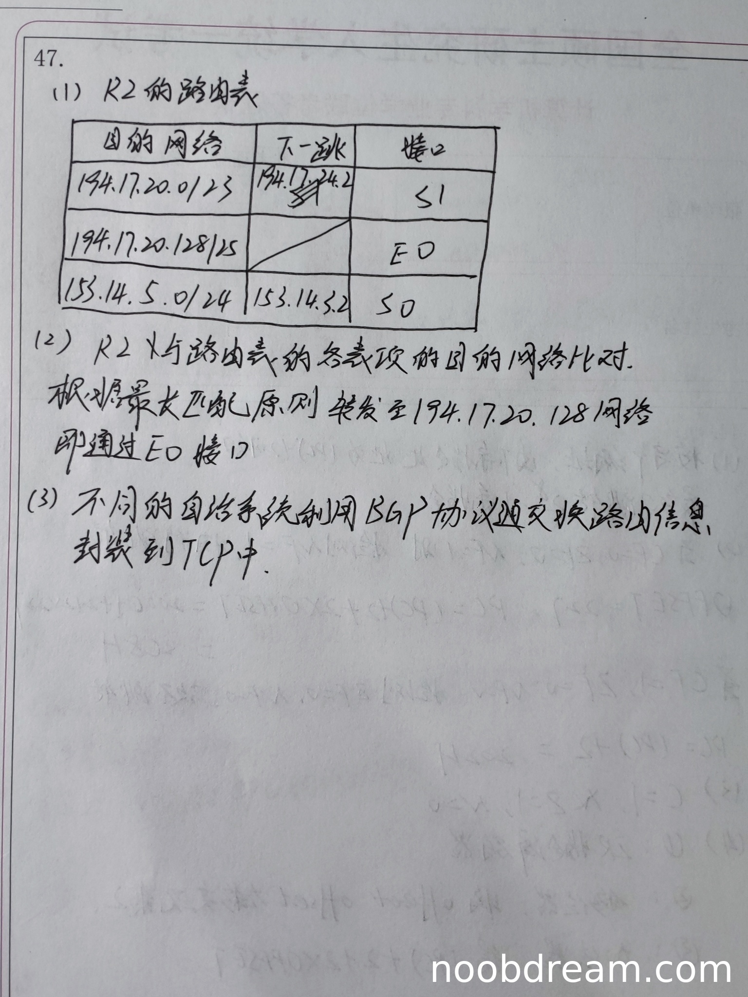 - 第二个路由项:目的网络194.17.20.128/25,下一跳为空白或"无明确内容",接口为E0(应为E0,识别为EO或E0,判断为误写不扣分)。标准答案中下一跳为"—"(直接接口),学生未明确写出,但接口正确,可认为部分正确。扣0.5分(下一跳部分),得1.5分。