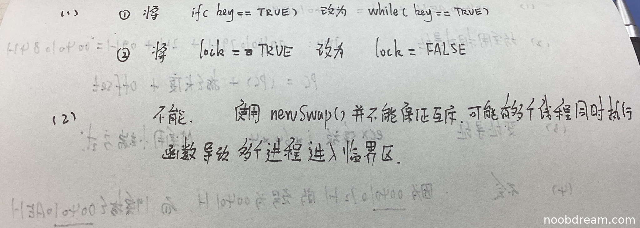 学生正确回答了"不能",并给出了基本正确的理由:使用newSwap()不能保证互斥,可能有多个线程同时执行函数导致多个进程进入临界区。虽然表述中"进程"应为"线程",但根据禁止扣分规则第2条,这属于识别错误或表述不严谨,不影响核心逻辑判断。学生答案抓住了关键点——newSwap()不是原子操作,可能导致多个线程同时进入临界区。因此本小题得3分。