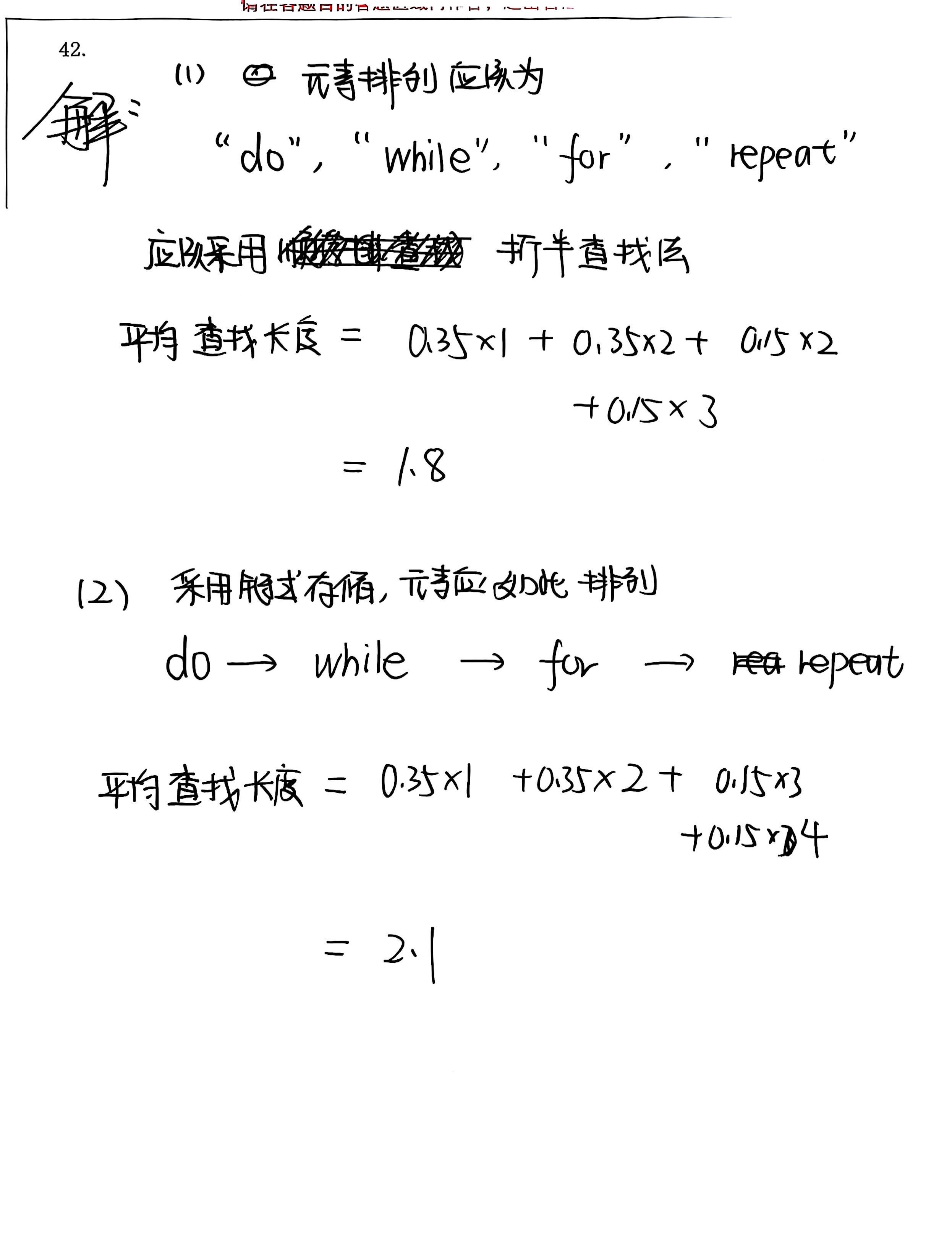 学生答案中,采用链式存储,元素排列为do → while → for → repeat,这符合按查找概率降序排列的原则(2分)。学生未明确说明查找方法,但根据排列和计算,隐含使用了顺序查找方法(1分)。平均查找长度计算正确为2.1(2分)。因此,本部分得分:5分。