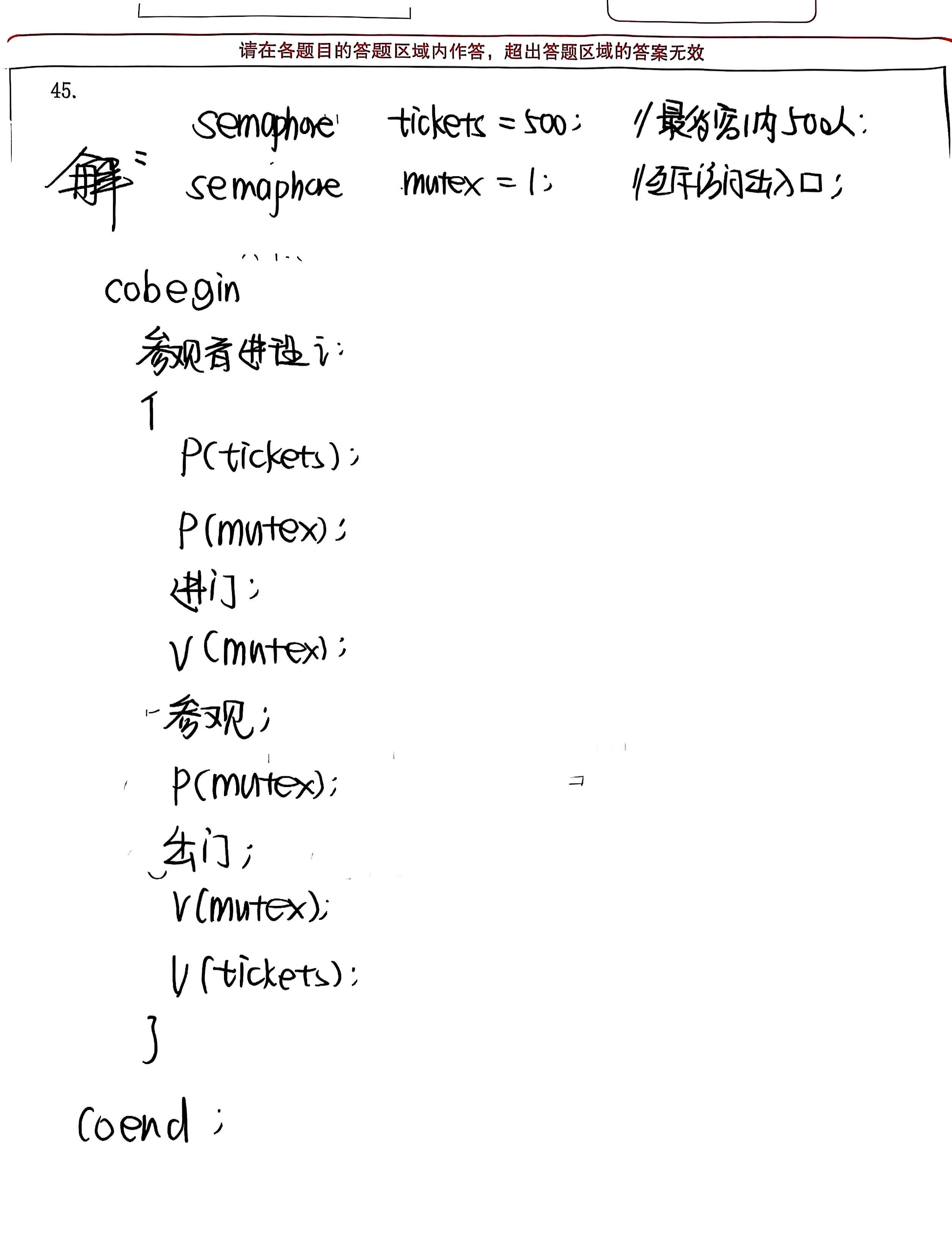 理由:对mutex的P、V操作完全正确,在进门和出门操作前后都正确使用了P(mutex)和V(mutex)来保证出入口的互斥访问。