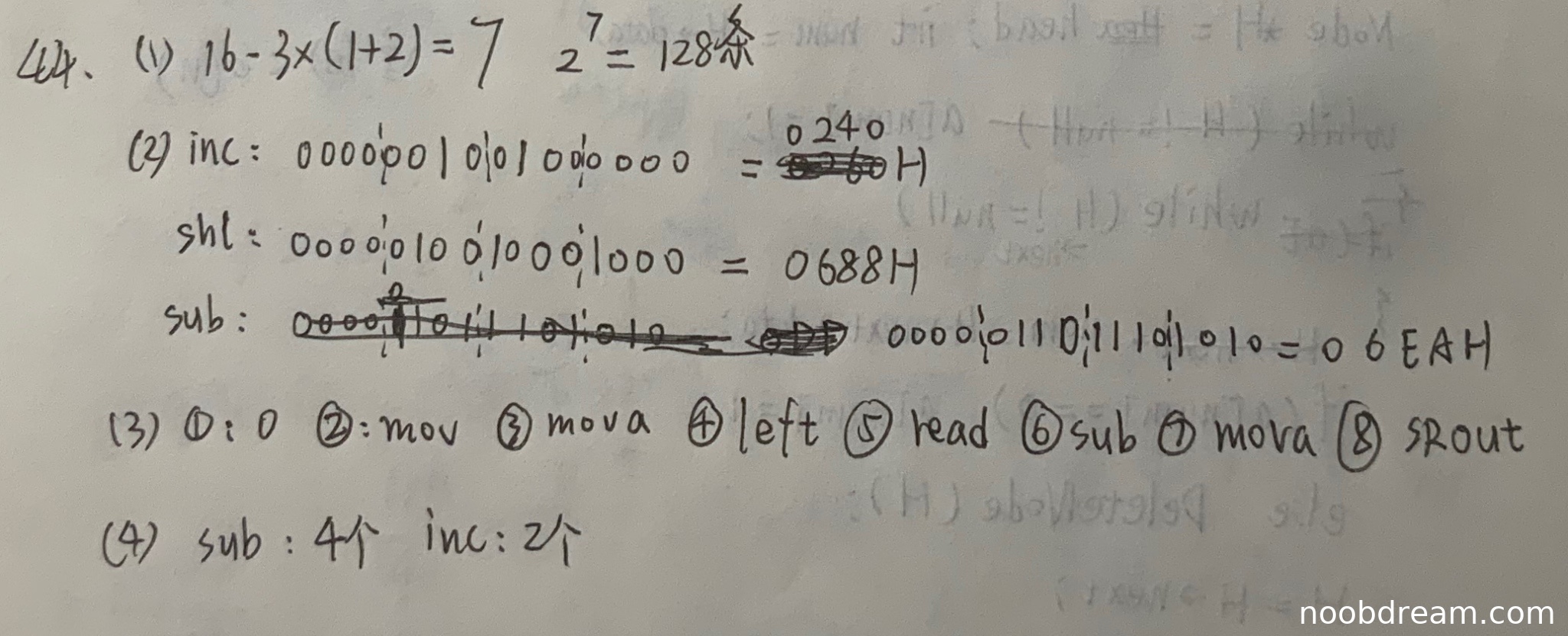 学生正确计算了指令操作码位数(16 - 3×(1+2) = 7位),并得出最多128条指令,与标准答案一致。得1分。