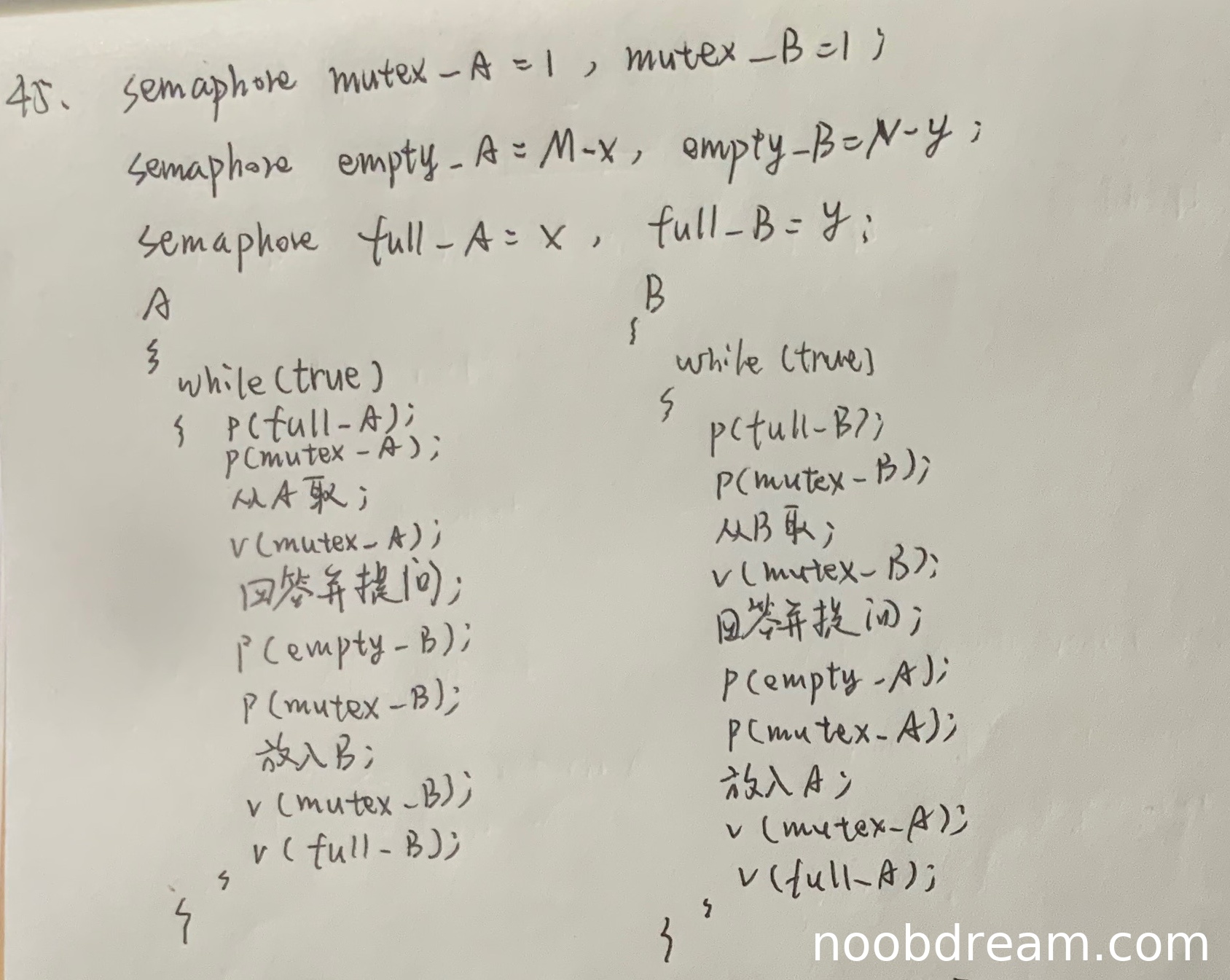 理由:学生定义了所有必要的信号量,包括mutex_A、mutex_B、empty_A、empty_B、full_A、full_B,且初值设置正确(mutex_A=1、mutex_B=1、empty_A=M-x、empty_B=N-y、full_A=x、full_B=y)。虽然信号量名称中使用了连字符(如mutex-A),但根据禁止扣分规则第1条,判断为识别误写,不扣分。