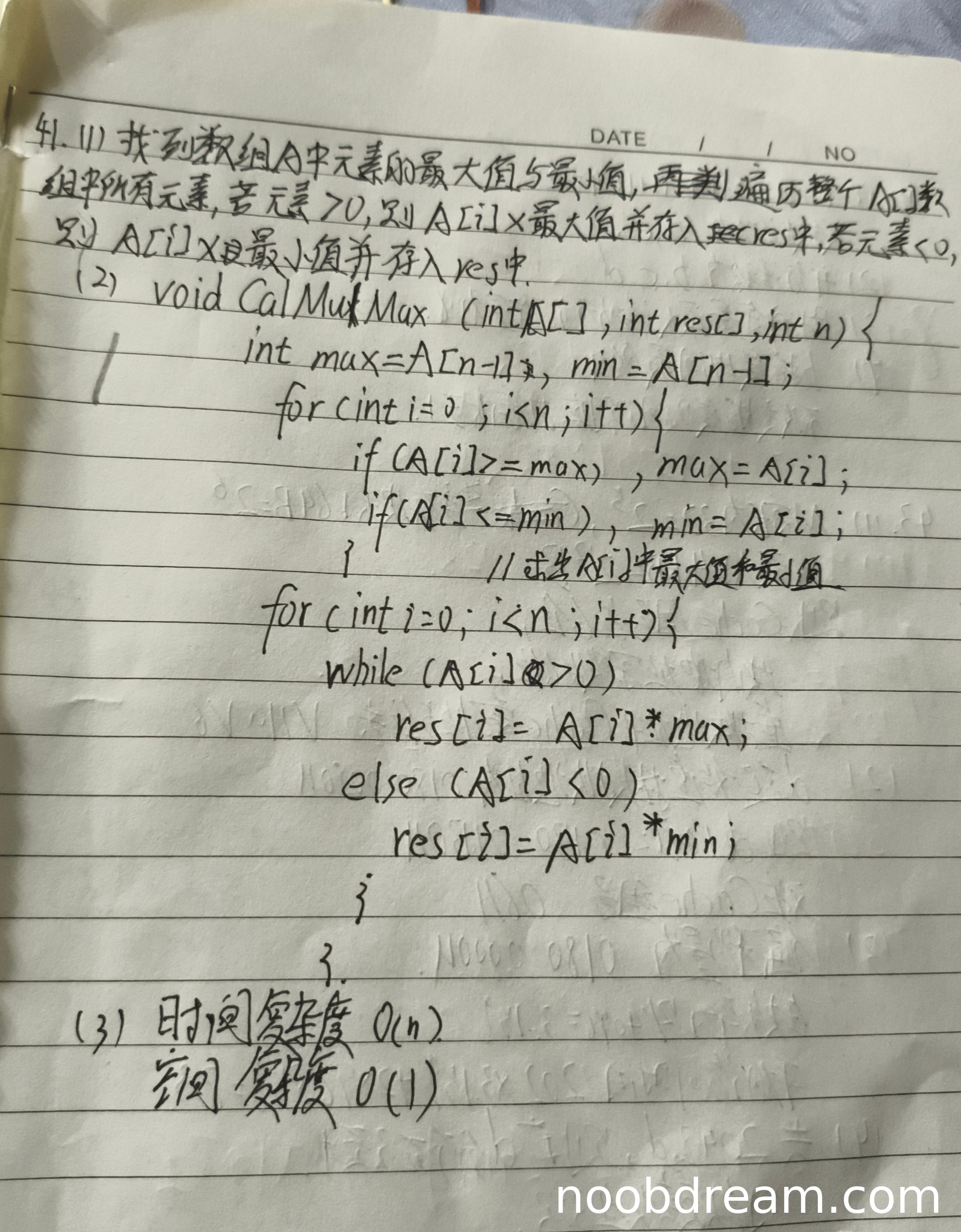 得0分。算法基本思想存在严重逻辑错误。学生思路是找到整个数组的最大值和最小值,然后根据A[i]的正负分别乘以最大值或最小值。但题目要求的是A[i]与A[j](i≤j≤n-1)乘积的最大值,即每个res[i]需要的是从i到n-1这个子数组范围内的乘积最大值。学生的思路无法处理动态变化的子数组范围,例如当A[i]为负数时,应该乘以子数组中的最小值(可能产生最大乘积),但学生的全局最小值可能出现在i之前,这不符合题目要求。