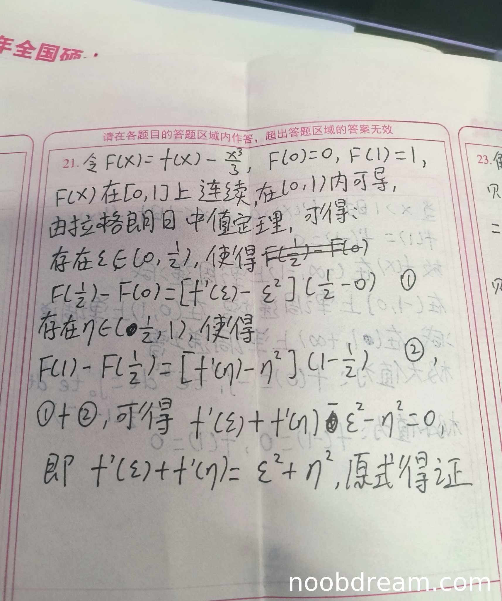 学生作答与标准答案思路基本一致,通过构造辅助函数 \(F(x) = f(x) - \frac{x^3}{3}\),并在区间 \([0,\frac{1}{2}]\) 和 \([\frac{1}{2},1]\) 上分别应用拉格朗日中值定理,最终得到所需结论。核心逻辑正确,证明过程完整。