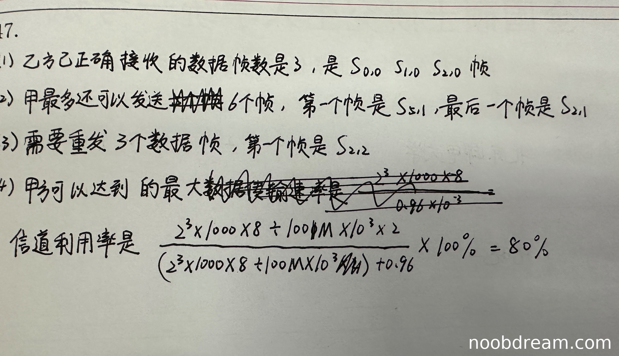 学生答案正确:乙方已正确接收的数据帧数是3,分别是S0,0、S1,0、S2,0。与标准答案一致,得3分。