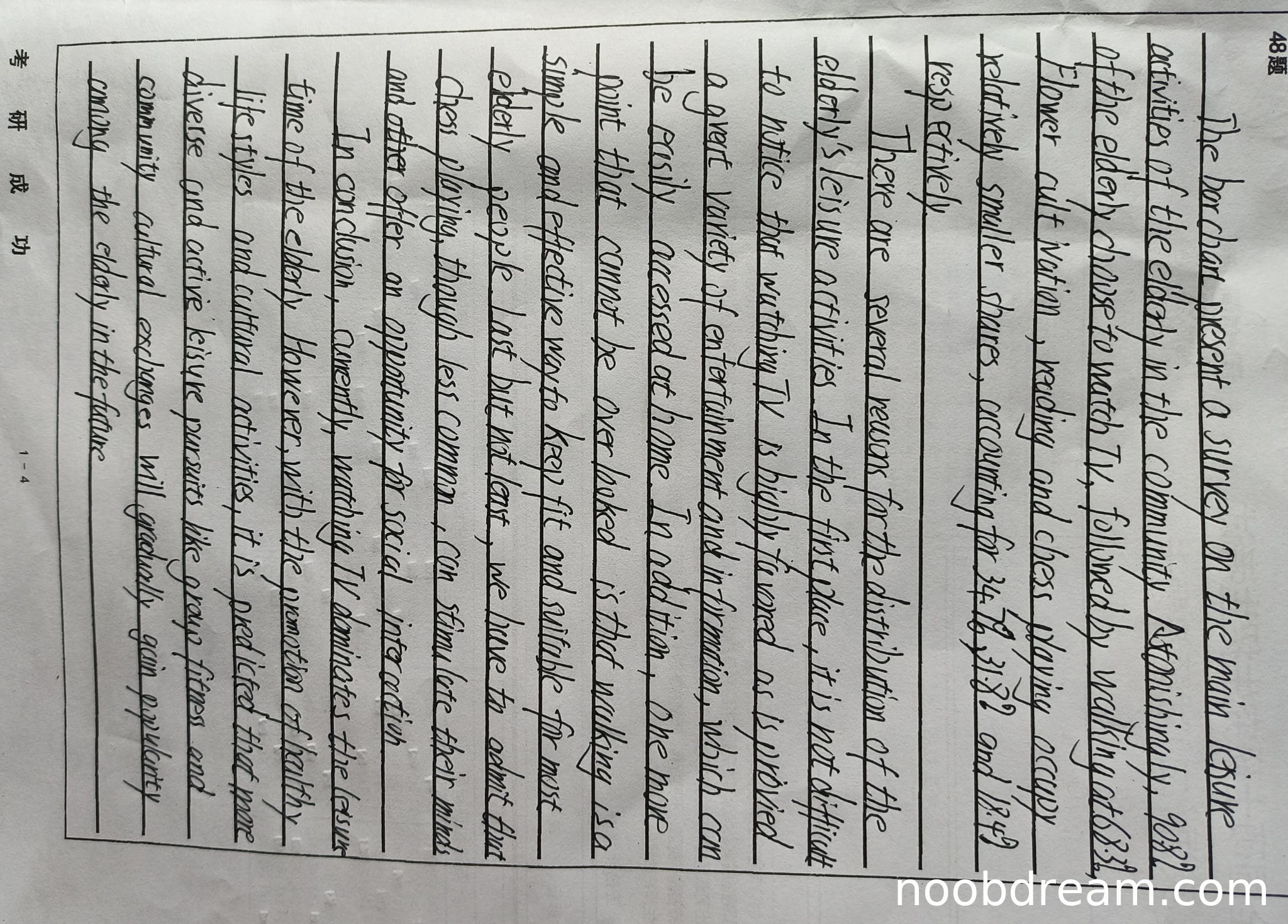 理由:评论部分逻辑基本清晰,分析了老年人选择不同休闲活动的原因:看电视提供娱乐信息、散步适合健身、下棋促进社交互动。语言表达较为流畅,使用了"in the first place"、"in addition"、"last but not least"等衔接手法。但分析深度不够,未能充分解释为什么养花、阅读等活动比例相对较低。