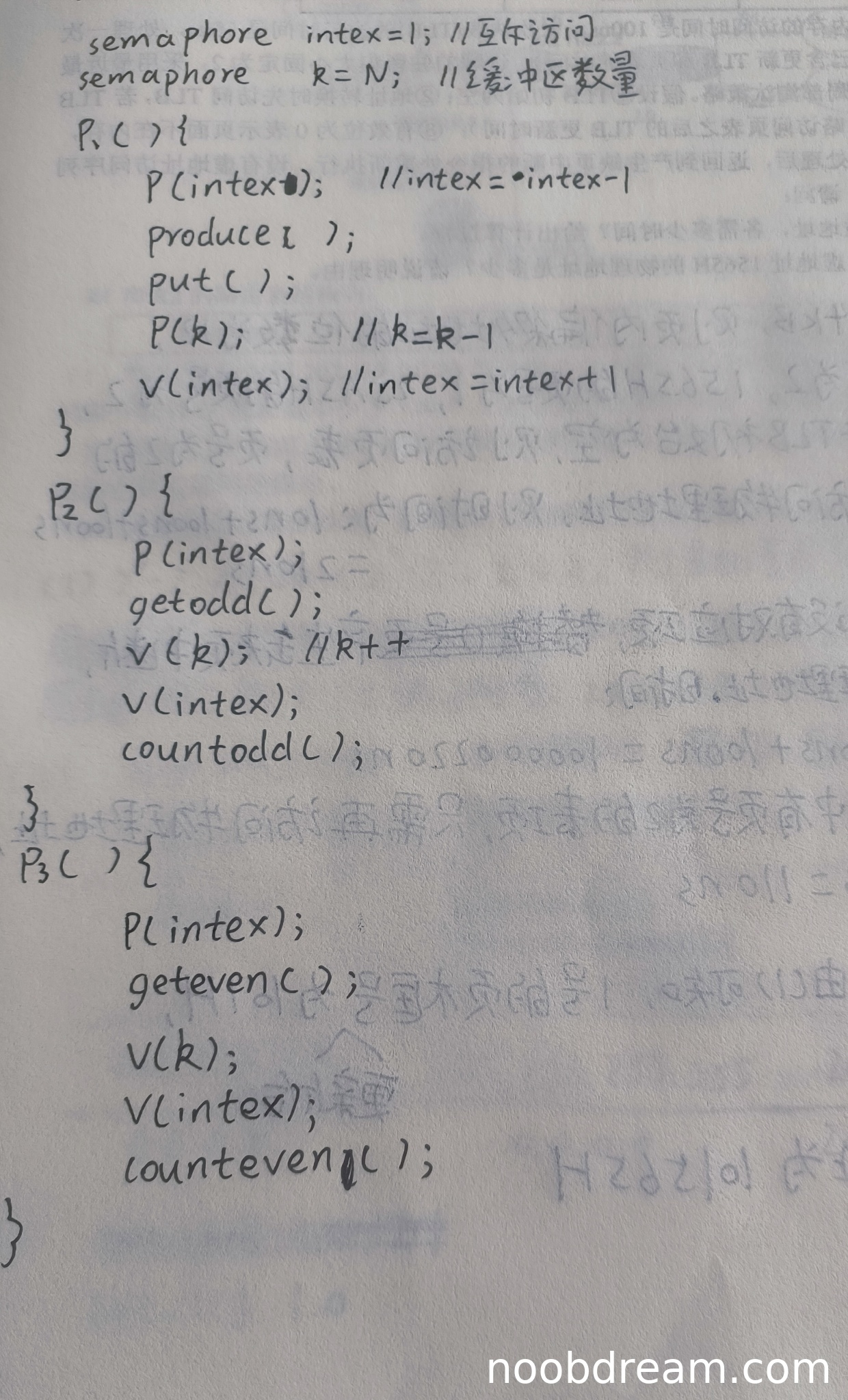 理由:P2和P3进程缺少等待奇偶数信号的同步操作(P(odd)和P(even)),导致无法正确实现同步。虽然互斥和缓冲区管理逻辑基本正确,但核心同步机制缺失,扣2分。考虑到互斥和缓冲区计数操作正确,给1分。