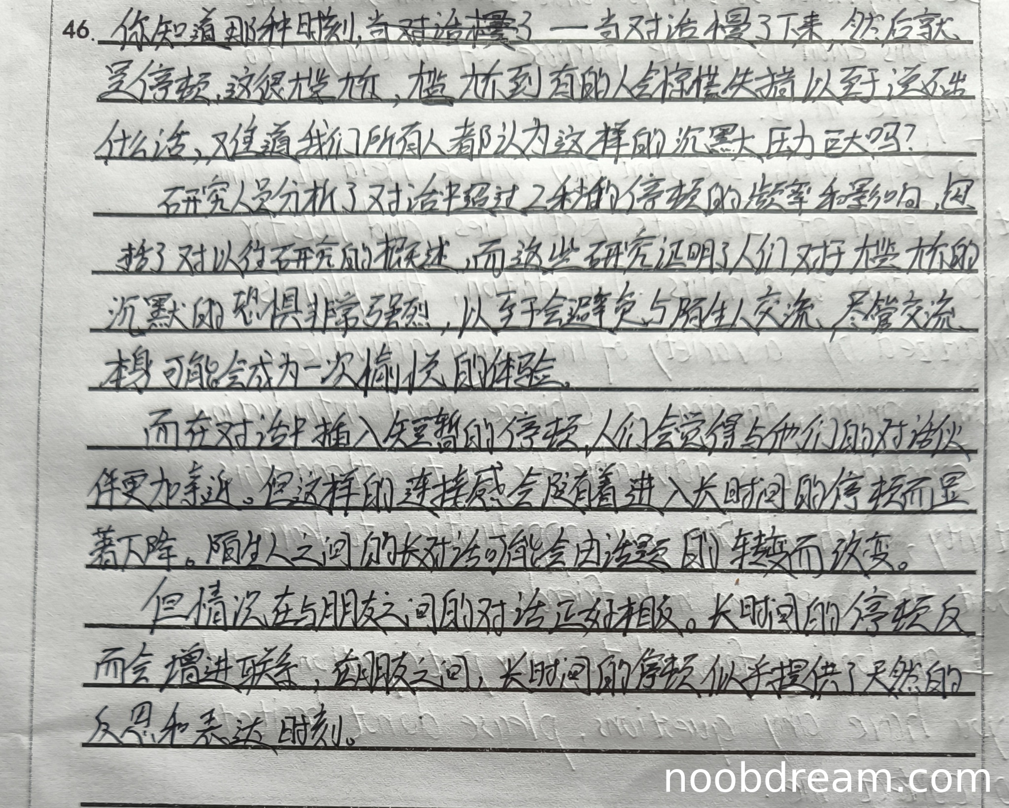 理由:该段翻译准确传达了朋友间对话停顿的特点,"情况正好相反"、"增进联系"、"天然的反思和表达时刻"等表达贴切自然,与标准答案高度一致。