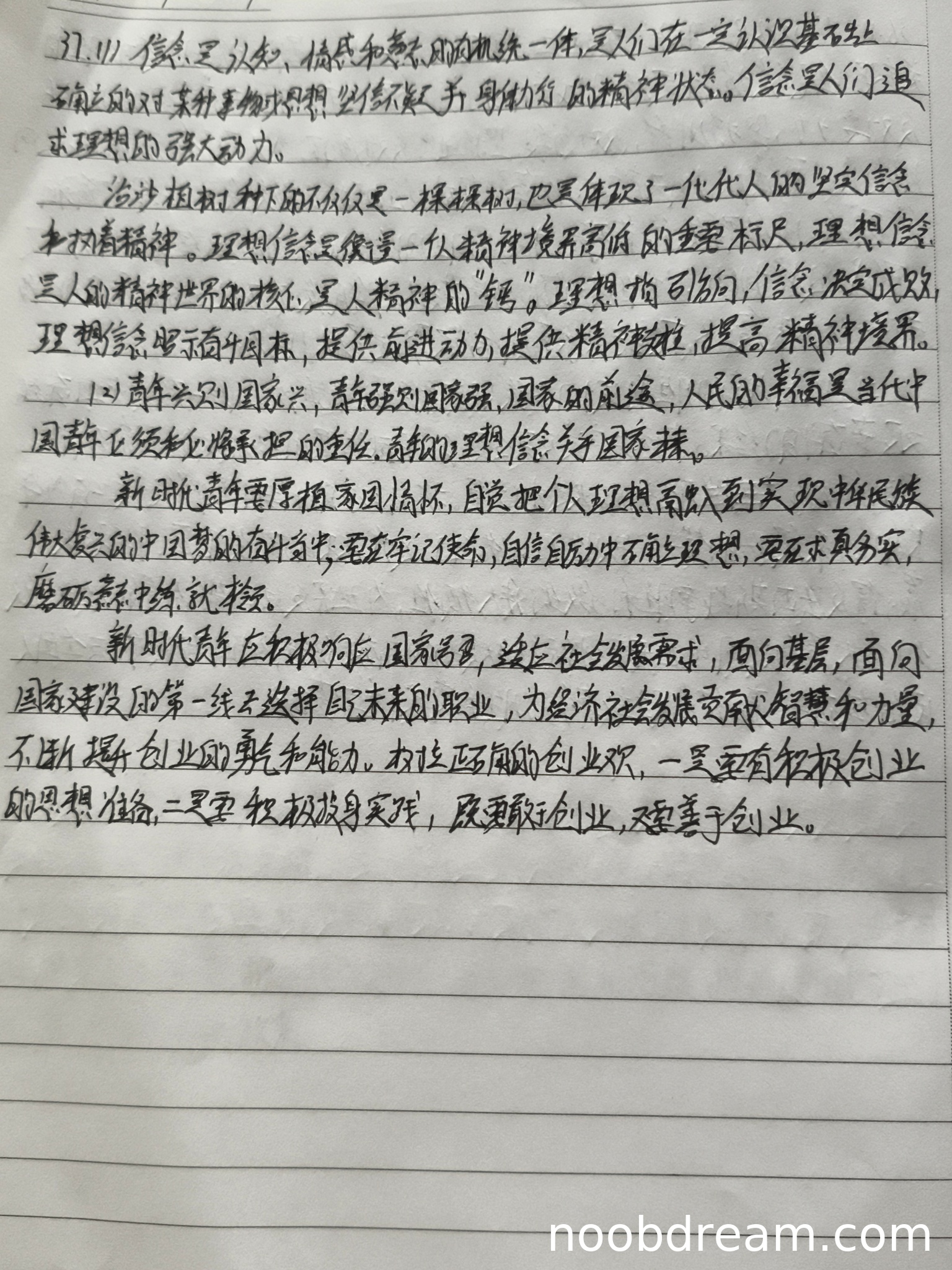 学生答案较为全面地回答了新时代青年应从治沙人事迹中汲取的力量,包括厚植家国情怀、将个人理想融入中国梦、牢记使命自信自励、求真务实磨砺本领、响应国家号召面向基层、树立正确创业观等,基本涵盖了标准答案的要求。答案中关于"树立正确的择业观和创业观"部分内容较为完整,体现了学习治沙人精神的要求。按照标准答案的评分要点,理想信念部分可得1分,择业创业观部分可得2分,总计3分。但相较于标准答案,在"立大志、明大德、成大才、担大任"和"听党话、跟党走"等表述上不够明确,扣1分。最终得分为3分。