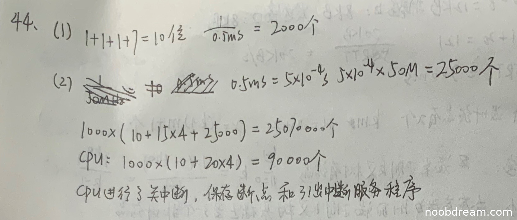 学生正确计算了完成1000个字符传送所需的总时钟周期为25070000(第一次识别结果)或2507000(第二次识别结果)。根据标准答案,25070000是正确的,而2507000可能是笔误(少写一个0),但根据"禁止扣分"规则中关于识别错误的规定,不扣分。CPU用于任务的时间计算正确为90000个时钟周期。中断响应阶段的操作描述正确(关中断、保存断点、引出中断服务程序)。因此得6分。