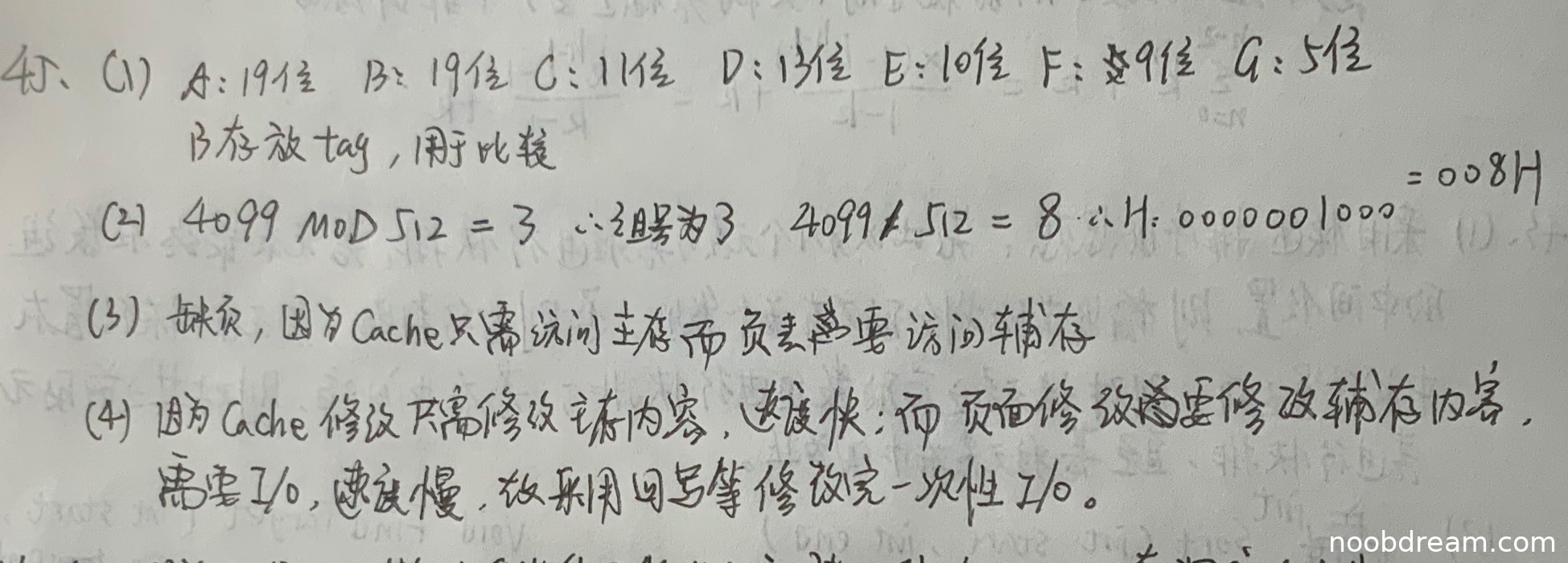 学生答案中,A、B、C、D的位数与标准答案一致,各得1分;E、F、G的位数错误(E应为9位,学生答10位;F应为9位,学生第一次识别为"变9位"但第二次识别为19位,均不正确;G应为6位,学生答5位),因此E、F、G各扣1分。TLB标记字段B中存放的信息描述为"tag,用于比较",基本正确但不够精确,标准答案为"虚页号",考虑到学生回答表达了标记比较的含义,给予0.5分。本小题得分:A(1分)+B(1分)+C(1分)+D(1分)+E(0分)+F(0分)+G(0分)+B字段信息(0.5分)=4.5分。