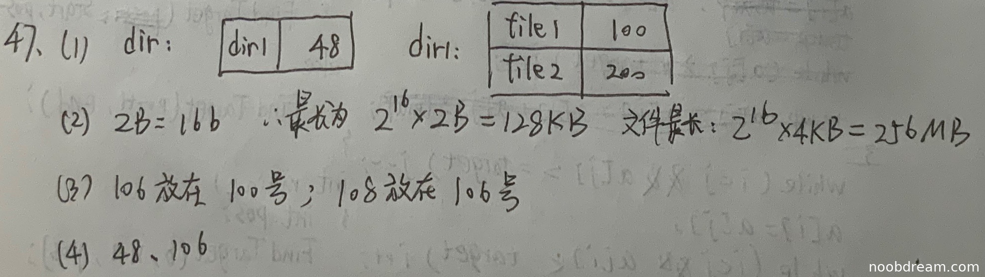 学生回答需要访问48号和106号簇。根据题目,要读取dir/dir1/file1的第5000个字节,需要先访问dir1目录文件(位于48号簇)获取file1的起始簇号,然后计算5000字节位于file1的哪个簇(5000/4096=1,即第二个簇,对应106号簇)。学生答案正确,因此得2分。
