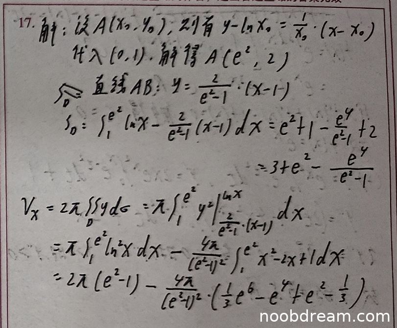 理由:学生正确设定了切点A的坐标,并通过切线条件正确求出A(e²,2),直线AB的方程也正确。面积计算思路正确(曲线减直线积分),但积分计算过程出现严重错误: