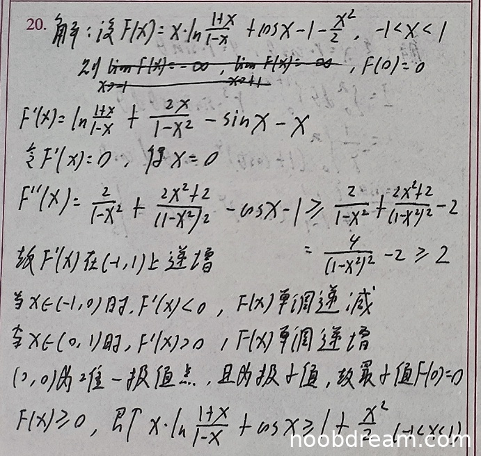 学生正确计算了一阶导数F'(x),找到了驻点x=0。但在二阶导数分析中存在严重逻辑错误:F''(x)的推导和估计不正确,特别是得出F''(x)≥2的结论是错误的(实际上在x接近±1时F''(x)会趋于无穷大,但推导过程有误)。基于错误的二阶导数分析得出F'(x)递增的结论,这是关键逻辑错误。扣2分。得2分。