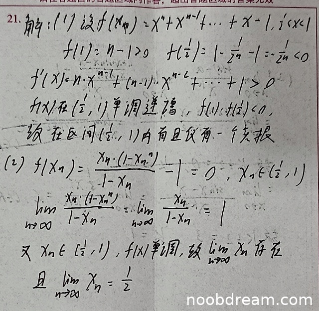 第1次识别中,函数定义有误:应为 \(f(x) = x^n + x^{n-1} + \cdots + x - 1\),但学生写作 \(f(x_n) = x^n + \cdots + x + 1\)(多了一个+1),这是关键错误。不过第2次识别已修正为正确形式 \(f(x) = x^n + \cdots + x - 1\)。根据"两次识别中一次正确不扣分"原则,此处不扣分。