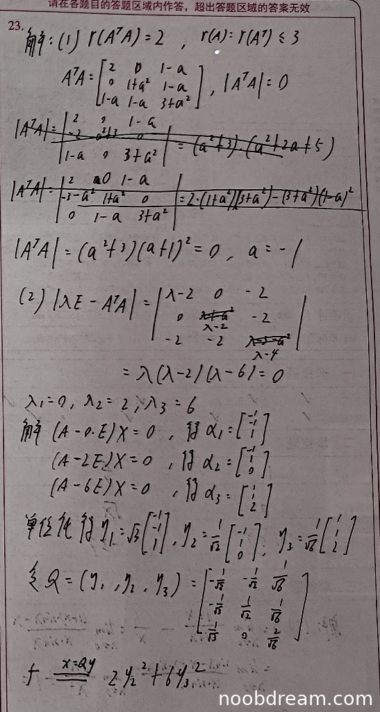 学生通过计算行列式|AᵀA|=0得到a=-1,与标准答案一致,但计算过程存在多处错误: