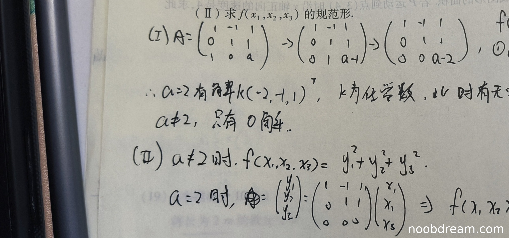 但在非零解的表达上,第一次识别结果为 \(k(-2,-1,1)^T\),第二次识别结果为 \(k(-2,1,1)^T\),而标准答案为 \(k(2,1,-1)^T\)。注意到 \((-2,-1,1)\) 与 \((2,1,-1)\) 仅差一个常数倍(-1倍),因此解空间相同,属于等价表达,不扣分。但第二次识别结果 \((-2,1,1)\) 与标准答案不等价,且代入原方程组验证不满足,属于错误。由于两次识别结果不一致,且存在一次错误,但考虑到可能是识别问题,且核心逻辑(秩、解的情况)正确,仅扣1分。