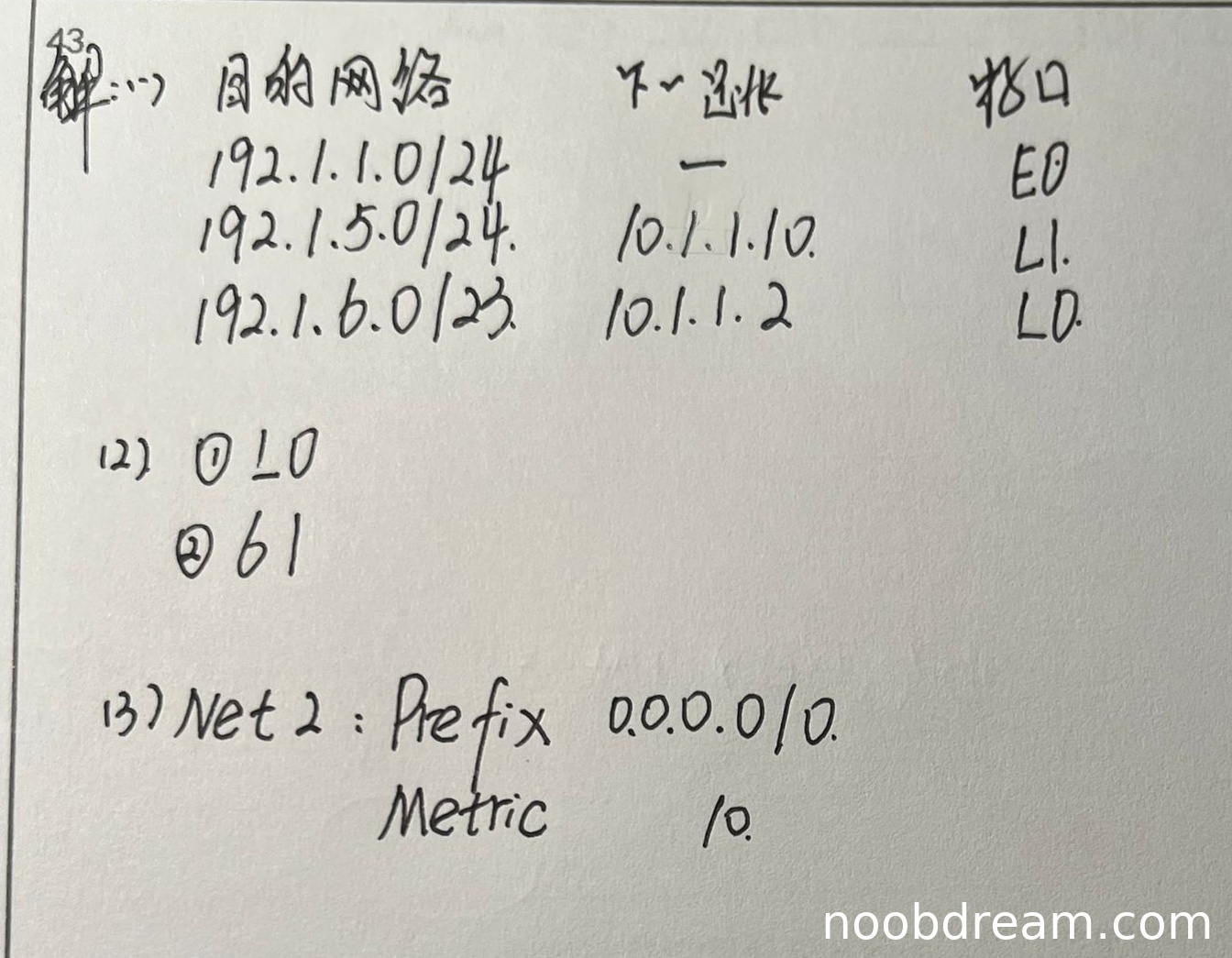学生答案中给出了三个路由项:192.1.1.0/24(直连,接口E0)、192.1.5.0/24(下一跳10.1.1.10,接口L1)、192.1.6.0/23(下一跳10.1.1.2,接口L0)。这些路由项与标准答案完全一致,特别是将192.1.6.0/24和192.1.7.0/24聚合为192.1.6.0/23,满足了路由项尽可能少的要求。因此得6分。