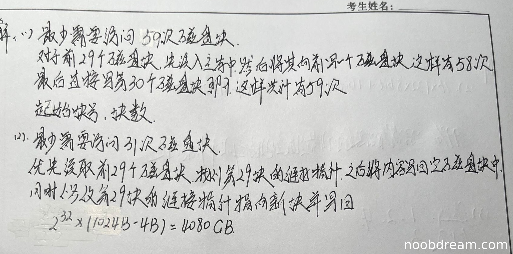 学生答案正确计算了链接分配方式下插入操作需要访问31次磁盘块,并正确计算出文件最大长度为4080GB。计算过程和结果与标准答案完全一致,因此得4分。