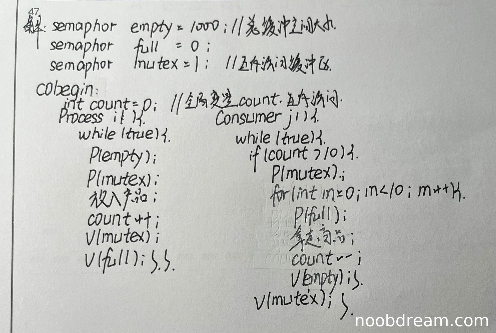 理由:生产者通过P(empty)/V(full)、消费者通过P(full)/V(empty)实现了基本的同步,但消费者实现中存在严重逻辑错误:在for循环内缺少V(empty)操作(第一次识别版本在循环内有V(empty),但第二次识别版本在循环外),且count变量的使用破坏了同步的正确性。扣1分。