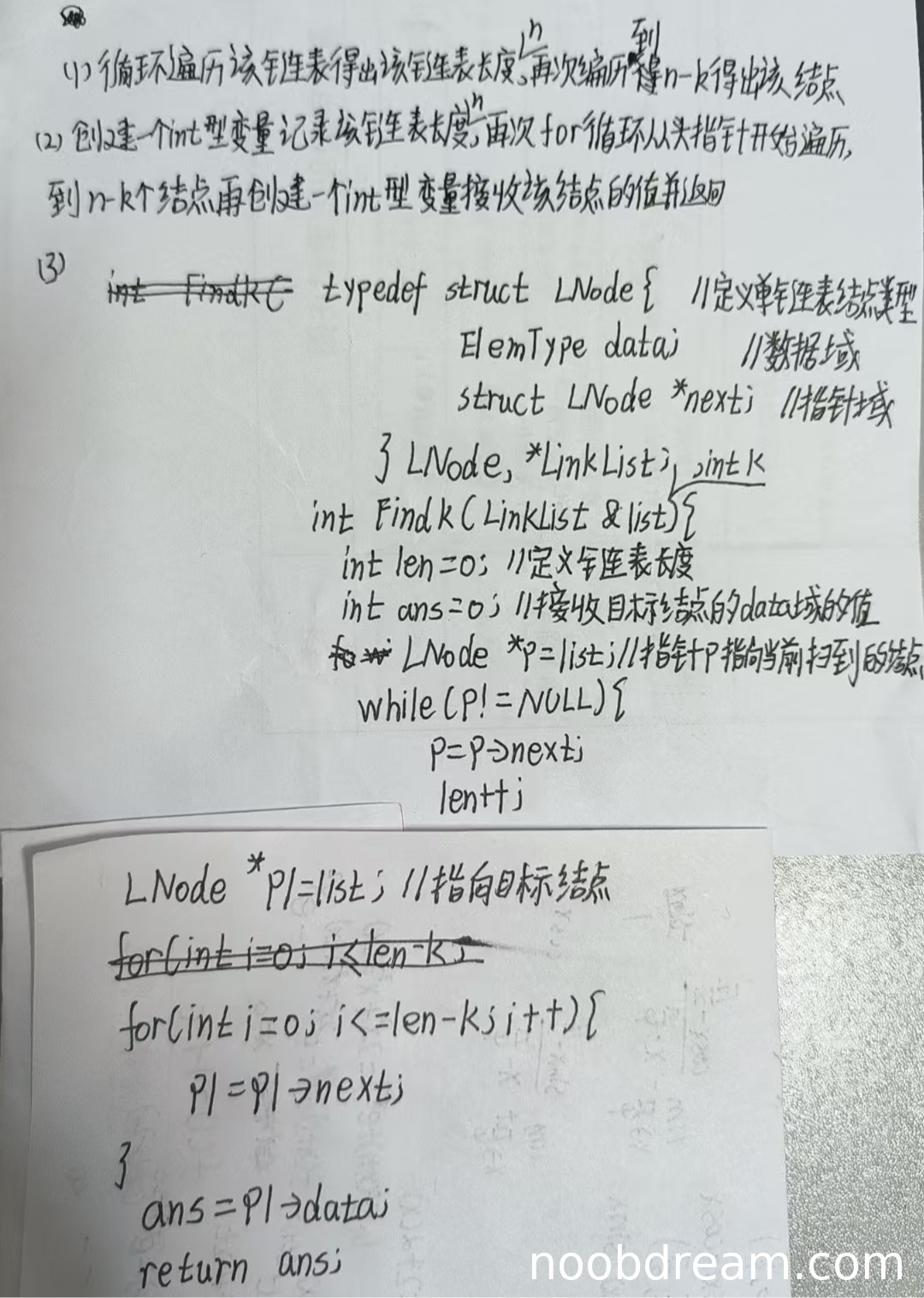 理由:学生详细描述了两次遍历的实现步骤,逻辑清晰,但步骤描述不够精确(如没有明确说明第一次遍历计算长度,第二次遍历定位目标结点)。由于方法效率不高,扣2分。