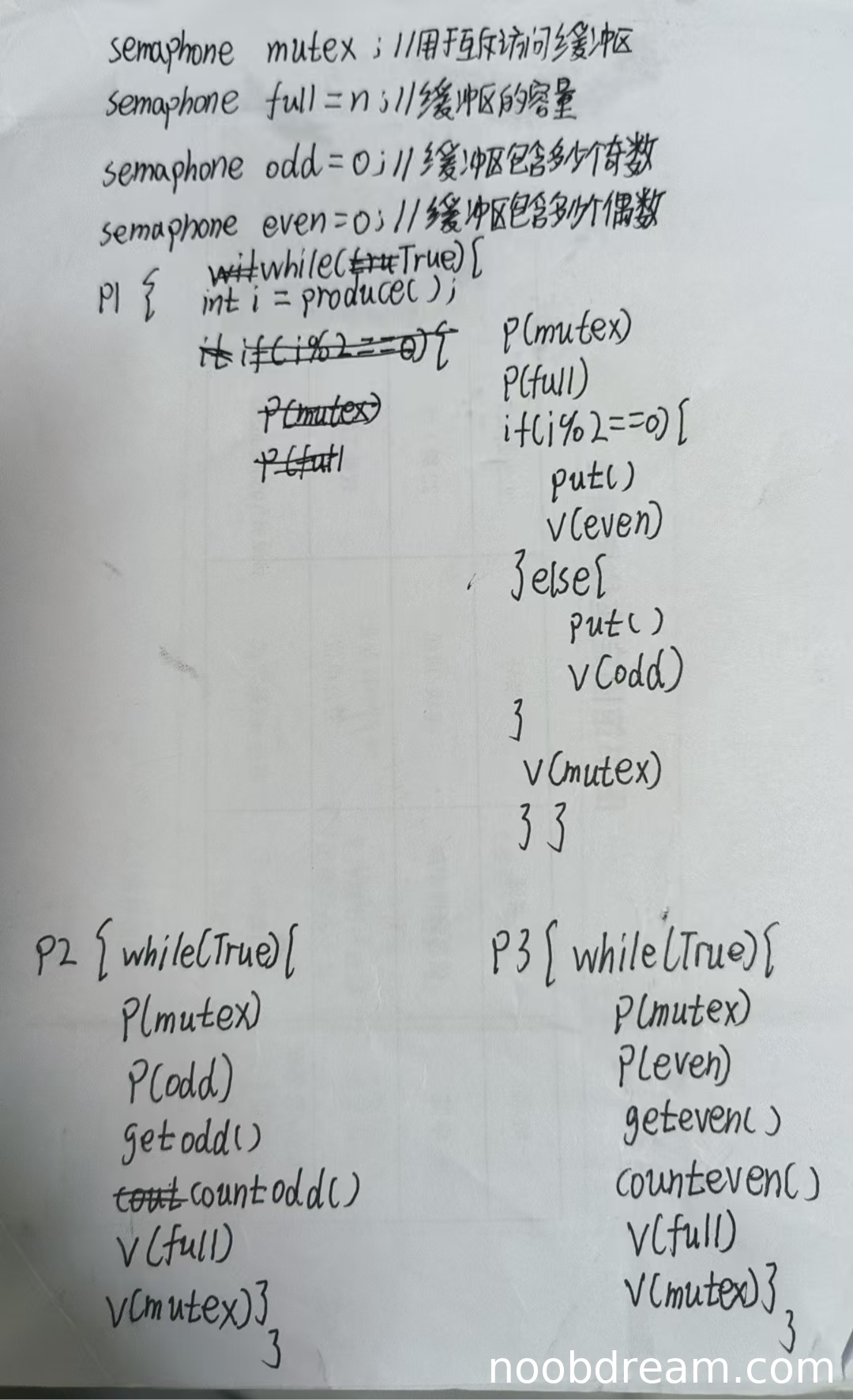 理由:P3进程与P2存在相同的问题,应该先P(even)再P(mutex),否则可能产生死锁。V(full)的位置是正确的。由于存在死锁风险这个严重逻辑错误,扣1分。