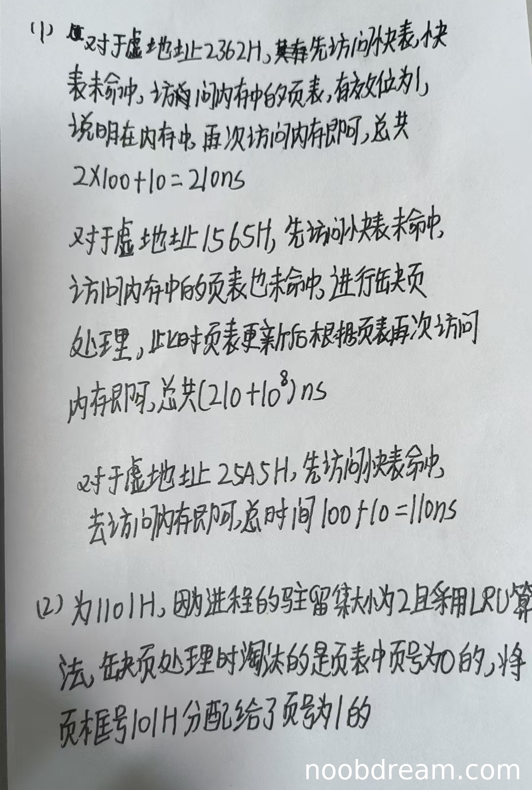对于虚地址2362H:学生计算过程正确,访问快表10ns(未命中)、访问页表100ns(命中)、访问内存100ns,总计210ns。与标准答案一致,得2分。
