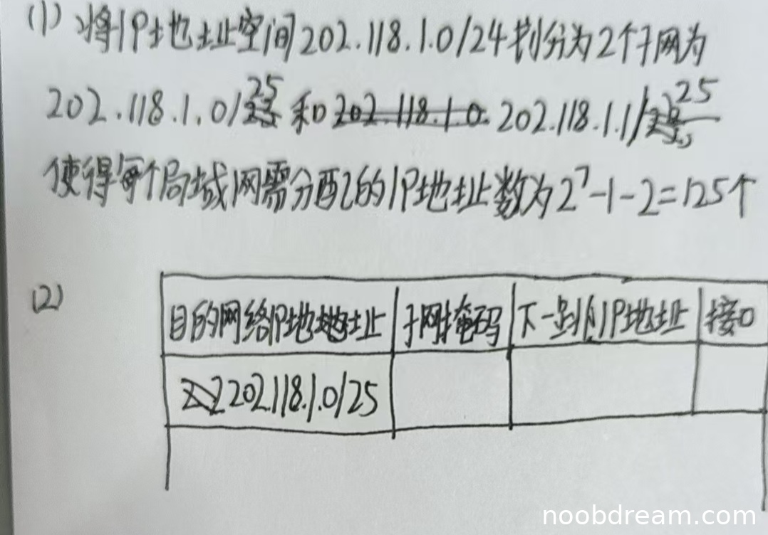 学生第1次识别结果中,子网划分写成了"202.118.1.0/25和202.118.1.0,202.118.1.1/25",这明显是错误的,但第2次识别结果正确给出了"202.118.1.0/25和202.118.1.128/25"。根据禁止扣分规则第3条,只要有一次识别正确就不扣分。学生正确计算了可用IP地址数为125个(2^7-2=126,学生写125可能是误写,不影响核心逻辑),子网划分正确。得3分。
