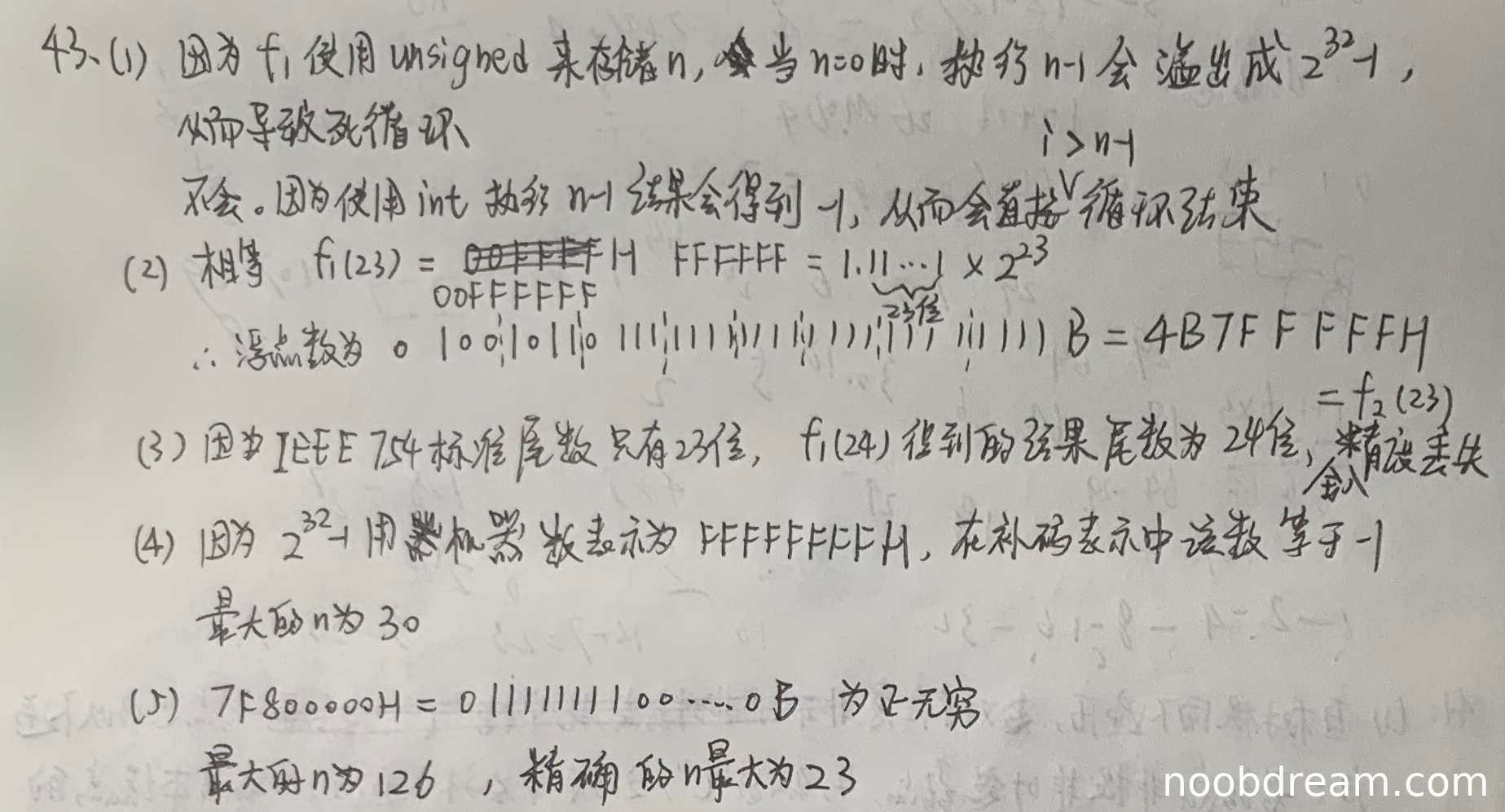 学生正确指出f1(23)和f2(23)返回值相等,并给出了f2(23)的机器数4B7FFFFFH(与标准答案一致)。但未给出f1(23)的机器数00FFFFFF(标准答案为00FFFFFF),此处缺失扣1分。得2分。
