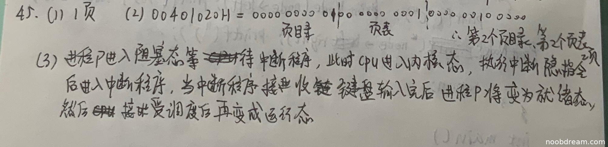 学生回答“第2个页目录、第2个页表”。标准答案为页目录第1个表项、页表第1个表项(编号从0开始)。学生将地址00401020H分解后得到页目录号=0000000001(二进制)=1,页表索引=0000000001(二进制)=1,但学生表述为“第2个”,这里存在逻辑错误(编号从0开始,实际应为第1个)。扣1分。但学生正确进行了地址分解并识别出页目录和页表索引相同,得1分。本小题最终得1分。