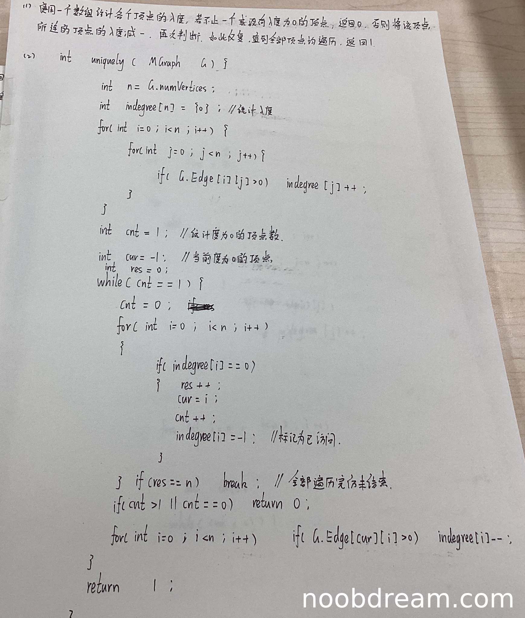 主要问题:当图中存在环时,代码可能无法正确检测。如果存在环,cnt可能为0,此时返回0,这是正确的。但代码逻辑在某些边界情况下可能不够严谨,比如当所有顶点都已访问但循环未及时终止的情况。