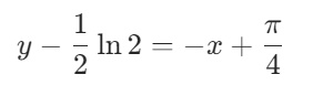 标准答案为 \(y + x - \frac{\pi}{4} - \ln \sqrt{2} = 0\)。注意到 \(\ln \sqrt{2} = \frac{1}{2} \ln 2\),因此标准方程可化为 \(y + x = \frac{\pi}{4} + \frac{1}{2} \ln 2\),即 \(y = -x + \frac{\pi}{4} + \frac{1}{2} \ln 2\),这与学生给出的斜截式完全一致。