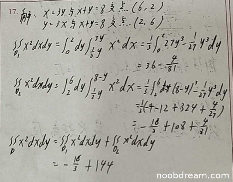 学生正确地将积分区域分为D₁和D₂两部分,并正确写出了积分表达式: - D₁:∫₀²dy∫y/33yx²dx - D₂:∫₂⁶dy∫y/38-yx²dx 这部分完全正确,得满分3分。