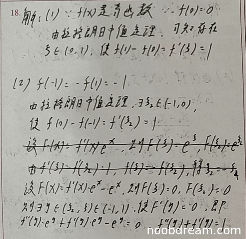 - 但后续推理混乱:设F(x)=f'(x)e^x后,F(ξ)=e^ξ,F(ξ₂)=e^{ξ₂},这与证明目标无关。