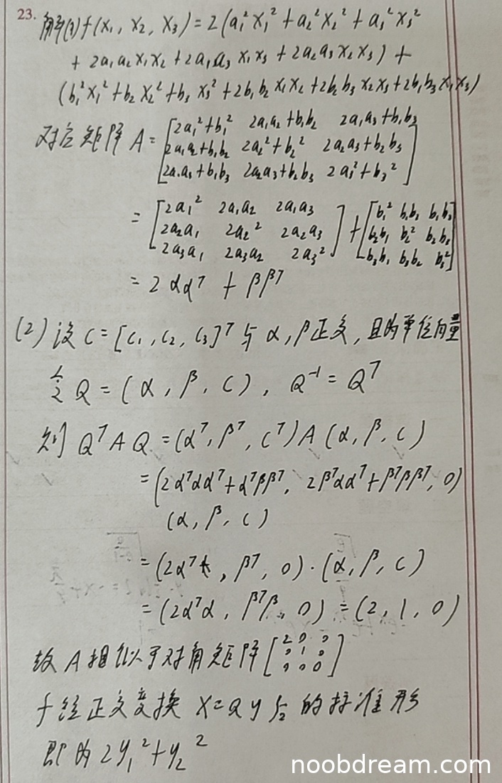 学生通过展开二次型并整理成矩阵形式,正确得到了对应的矩阵为 \(2\alpha\alpha^T + \beta\beta^T\)。虽然标准答案中写的是 \(2\alpha^{\top}\alpha+\beta^{\top}\beta\),但 \(\alpha\alpha^T\) 与 \(\alpha^{\top}\alpha\) 是等价的(都是3×3矩阵),因此逻辑正确。但学生最后写的是 \(2\alpha\alpha^T+\beta\beta^T\),而题目要求证明的是 \(2\alpha^{\top}\alpha+\beta^{\top}\beta\),这里符号使用不一致,但由于实质相同,不视为错误。不过学生在矩阵展开过程中存在一些书写不规范(如混合使用了 \(a_1a_2\) 和 \(a_2a_1\),但对称矩阵中不影响),整体思路和结果正确。考虑到第(1)问满分应为5.5分(因为总分11分,两问各占一半),扣1分以反映书写和符号不规范的问题。